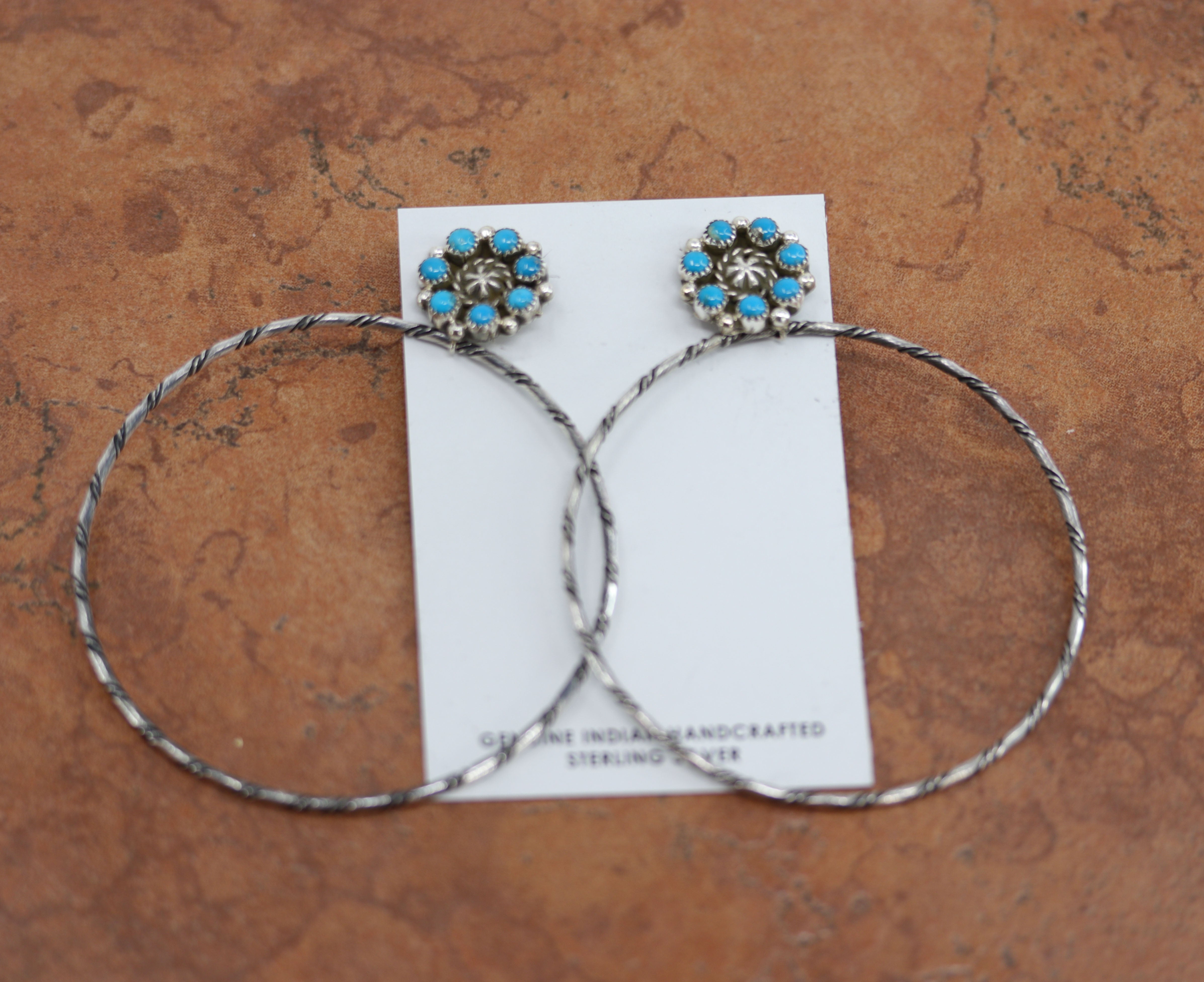 Navajo Silver Turquoise Cluster Twist Wire Hoop Earrings