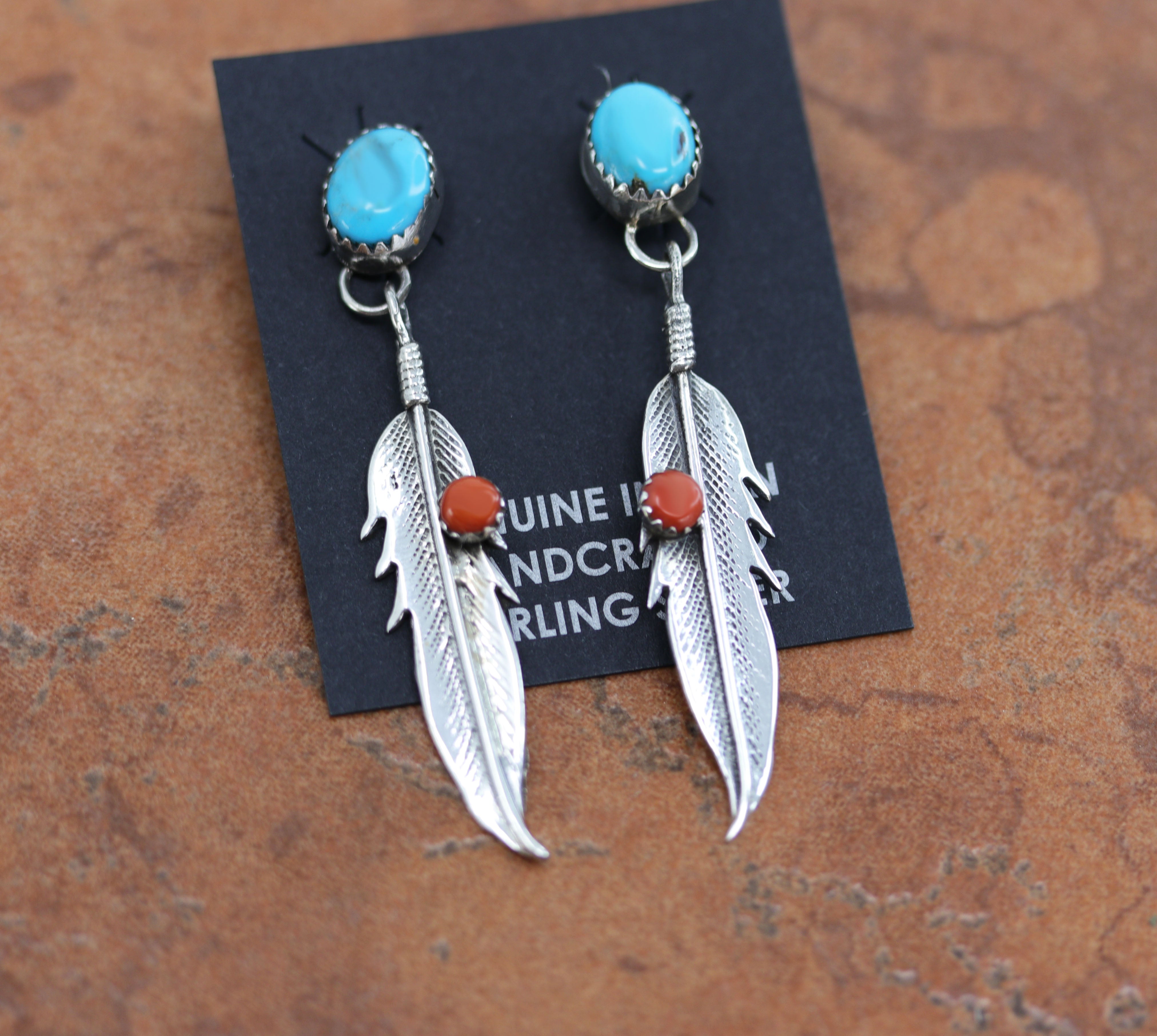 Beautiful Navajo Native American earrings. They are made from sterling silver, coral, and turquoise. The earrings are about 2 1/4" in length and 1/2" wide.