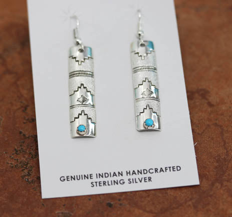 Navajo Native American earrings by Jan Mariano. They are made from sterling silver and turquoise. The earrings are about 2 1/4" in length including the hook and 1/2" wide.