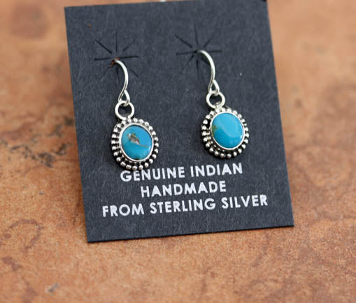 Gorgeous Navajo Native American earrings by Jan Mariano. They are made from sterling silver and turquoise. The earrings are about 1" in length including the hook and 3/8" wide.