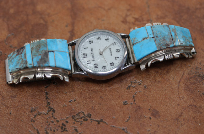 A very nice Navajo Native American mens watch. It is made from sterling silver, stainless steel, and turquoise. The designs are 2" in length, and the watch itself is about 1 1/4" in diameter. The whole watch including the wristband can fit anywhere for a 8" - 10" wrist.