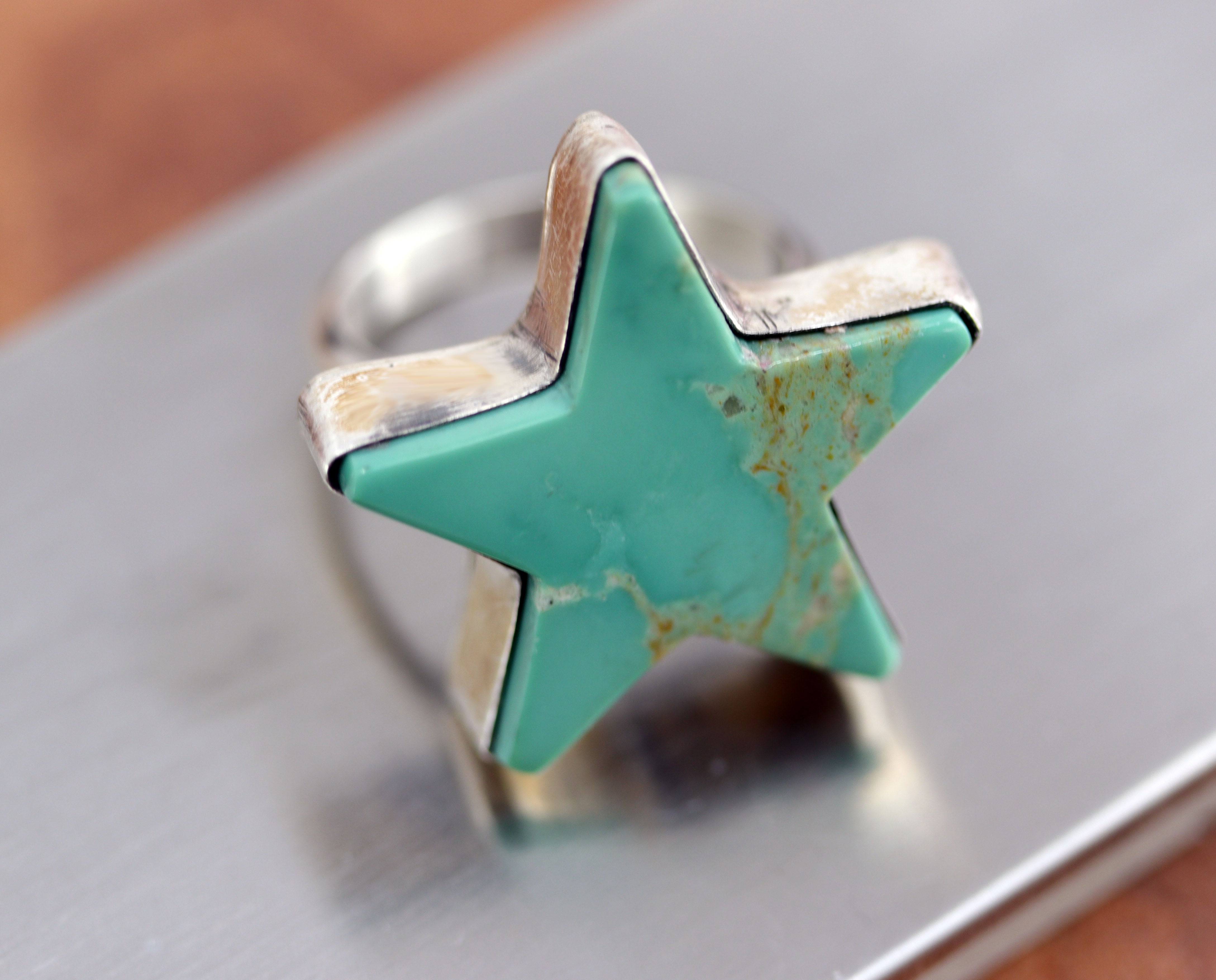 A beautiful Navajo Native American ring. It is made from sterling silver and turquoise. The ring size is adjustable and fits sizes 6 to 8 and it is 1 1/8" in length.