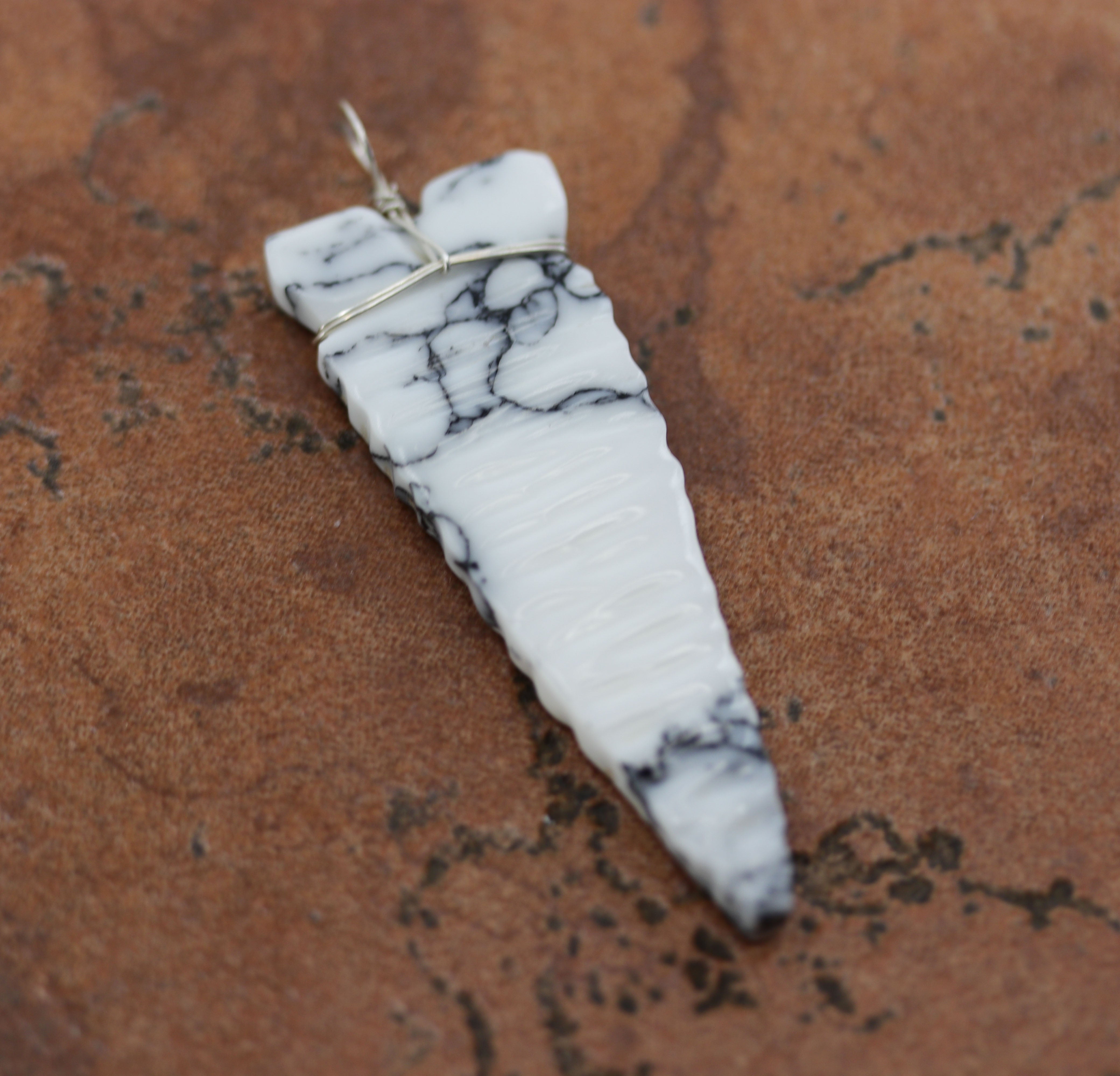 A beautiful Navajo Native American pendant. It is made from sterling silver and man made block white buffalo. The pendant is about 2 3/8" in length (including the bail) and about 7/8" at the widest point.