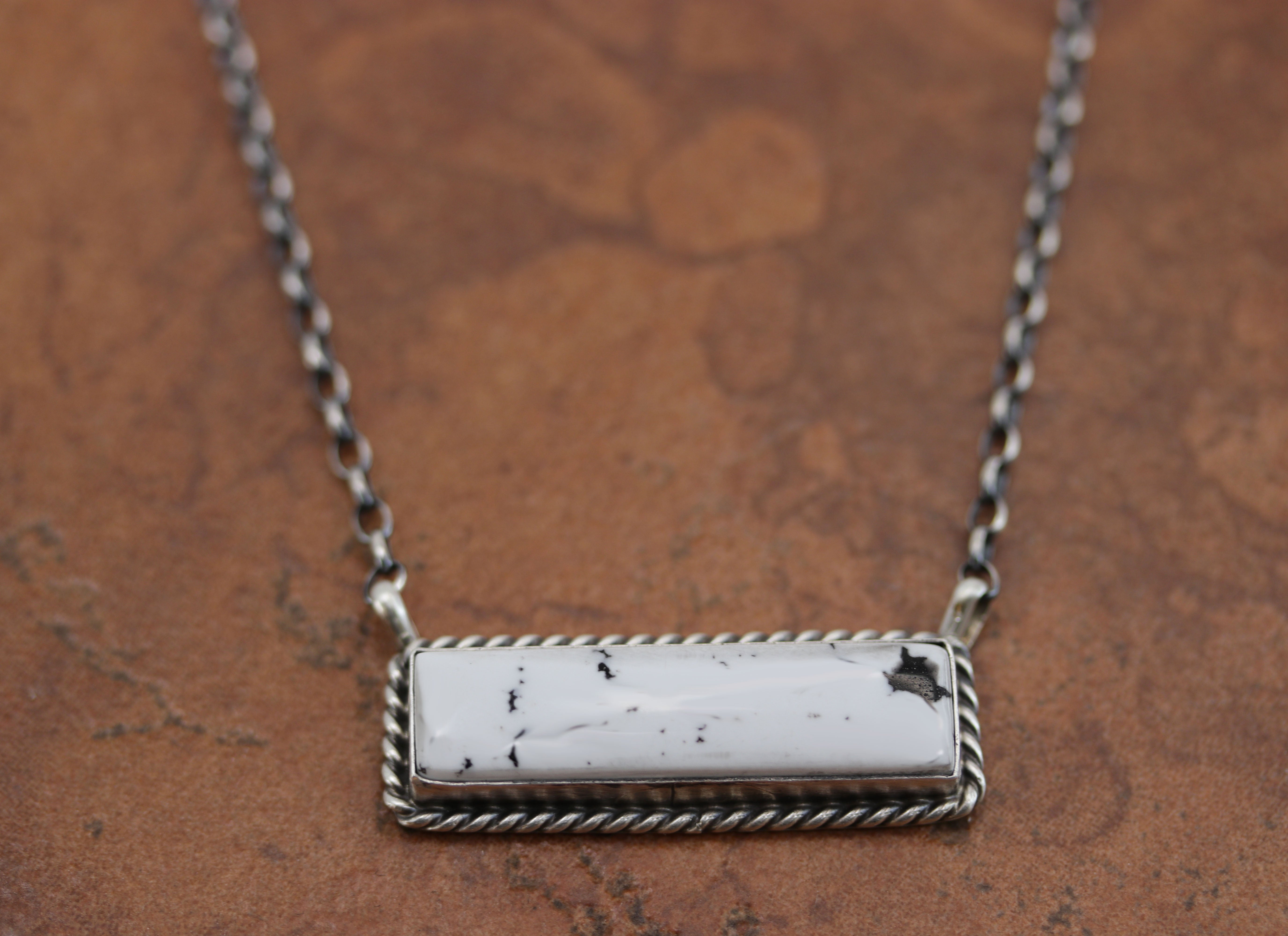 A beautiful Navajo Native American necklace. It is made from sterling silver, and white buffalo. The necklace is about 18" in length. The center pendant measures 1 7/8" by 7/8".