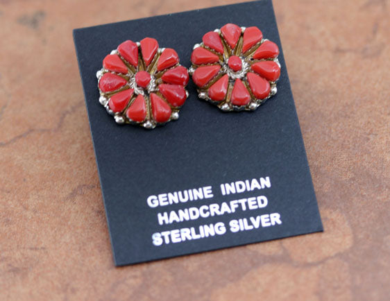 Authentic beautiful Navajo Native American cluster earrings. They are made from sterling silver and man made coral. The earrings are about 7/8" in diameter.