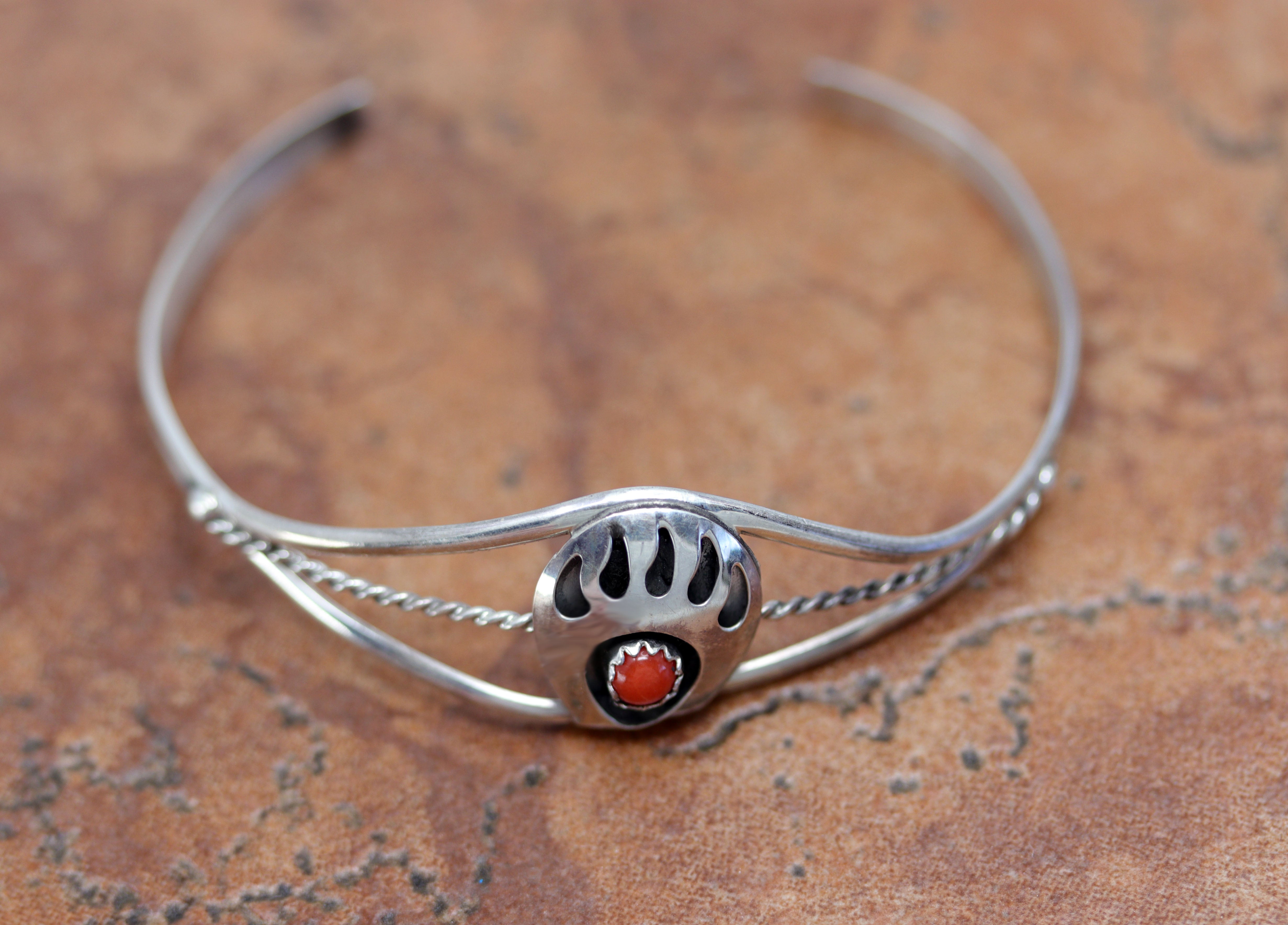 Navajo Sterling Silver Coral Bear Paw Bracelet