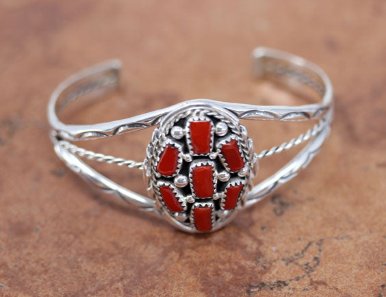Navajo Native American bracelet. It is made from sterling silver and coral. It is about 5 3/4" around and about 1 1/4" wide at the widest point. The opening is about 1 1/4", and partly flexible.