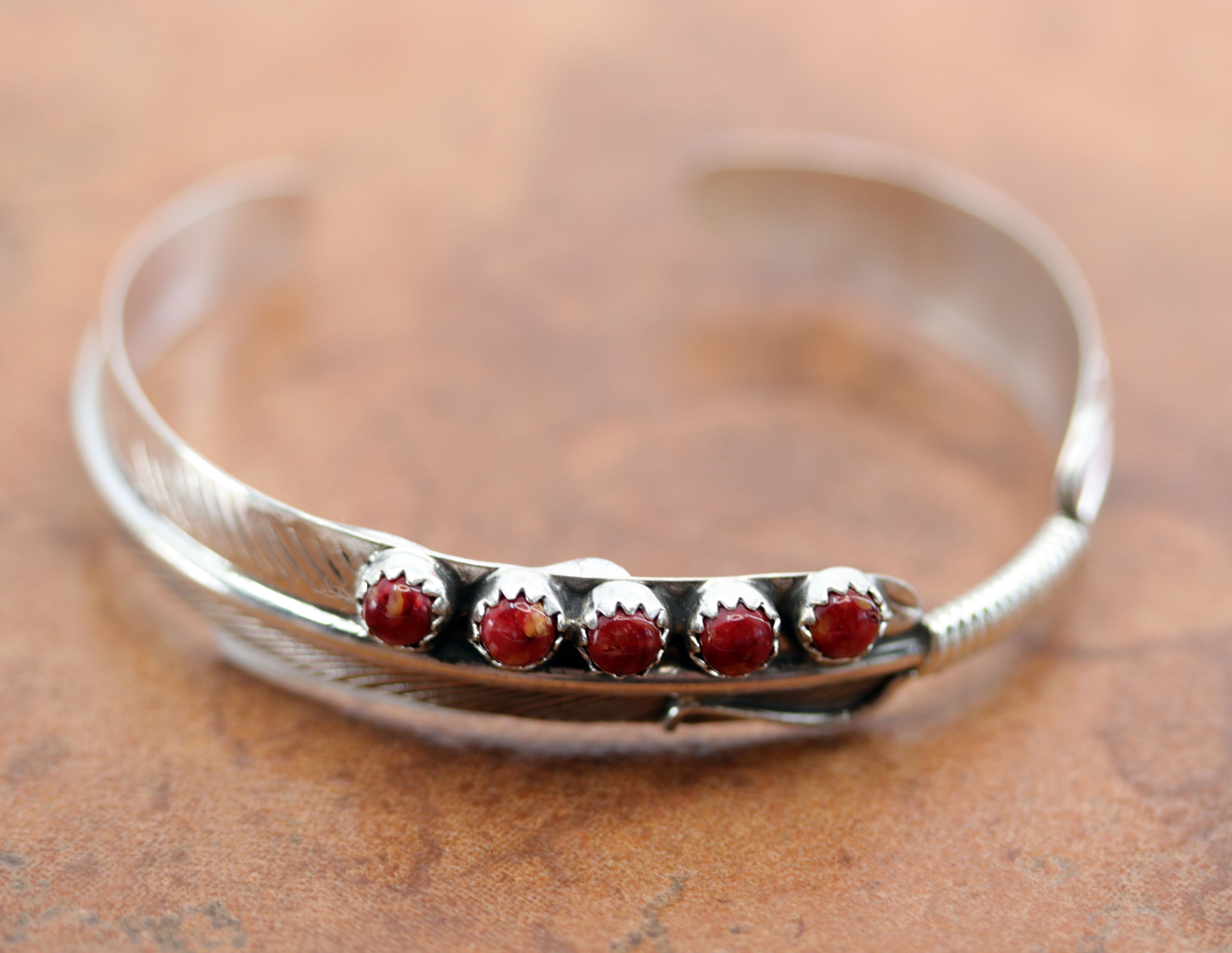 Navajo Sterling Silver Coral Feather Cuff Bracelet