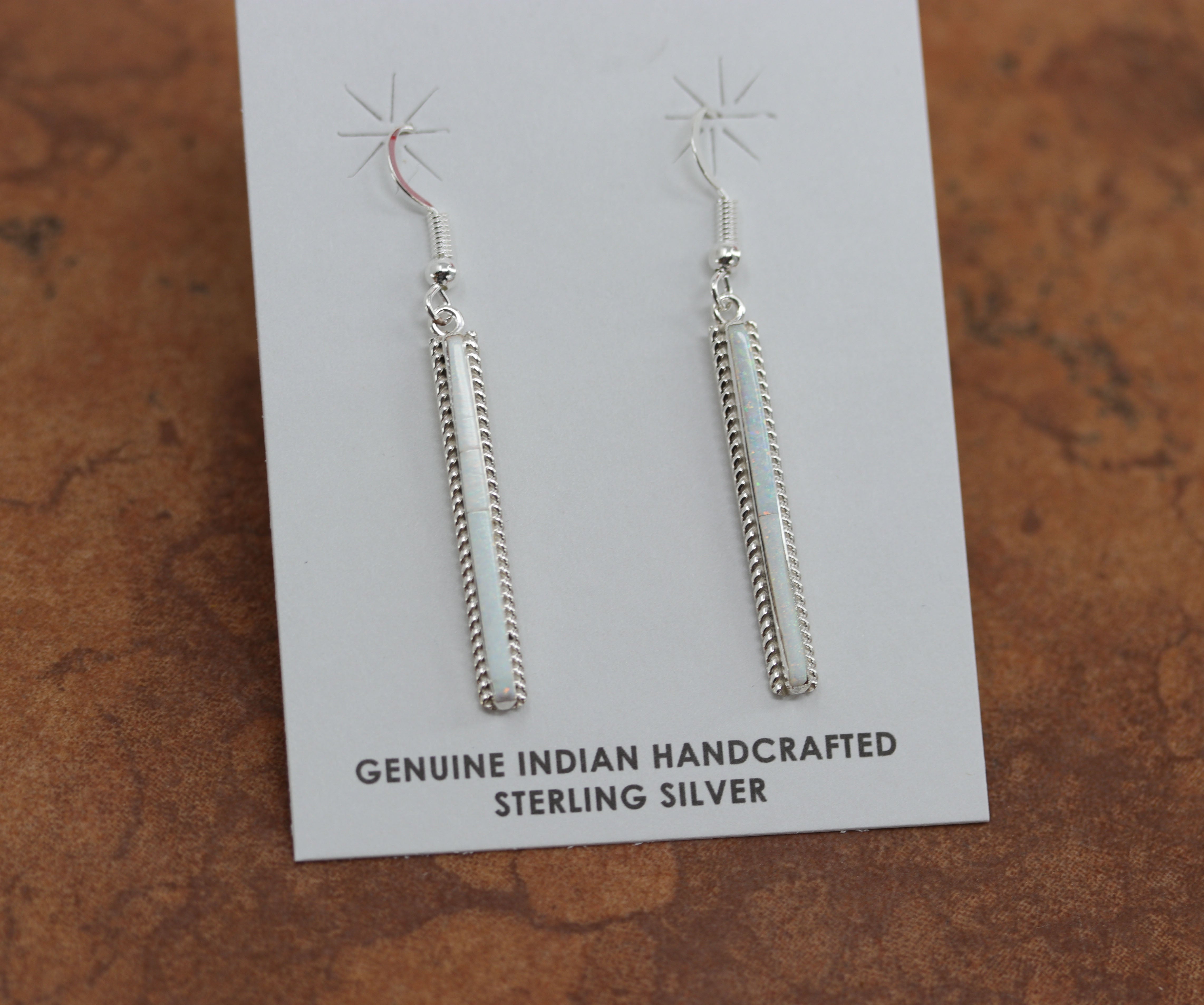 A beautiful Navajo Native American earrings. They are made from sterling silver and created opal. The earrings are about 2" in length including the hook and 1/4" wide.