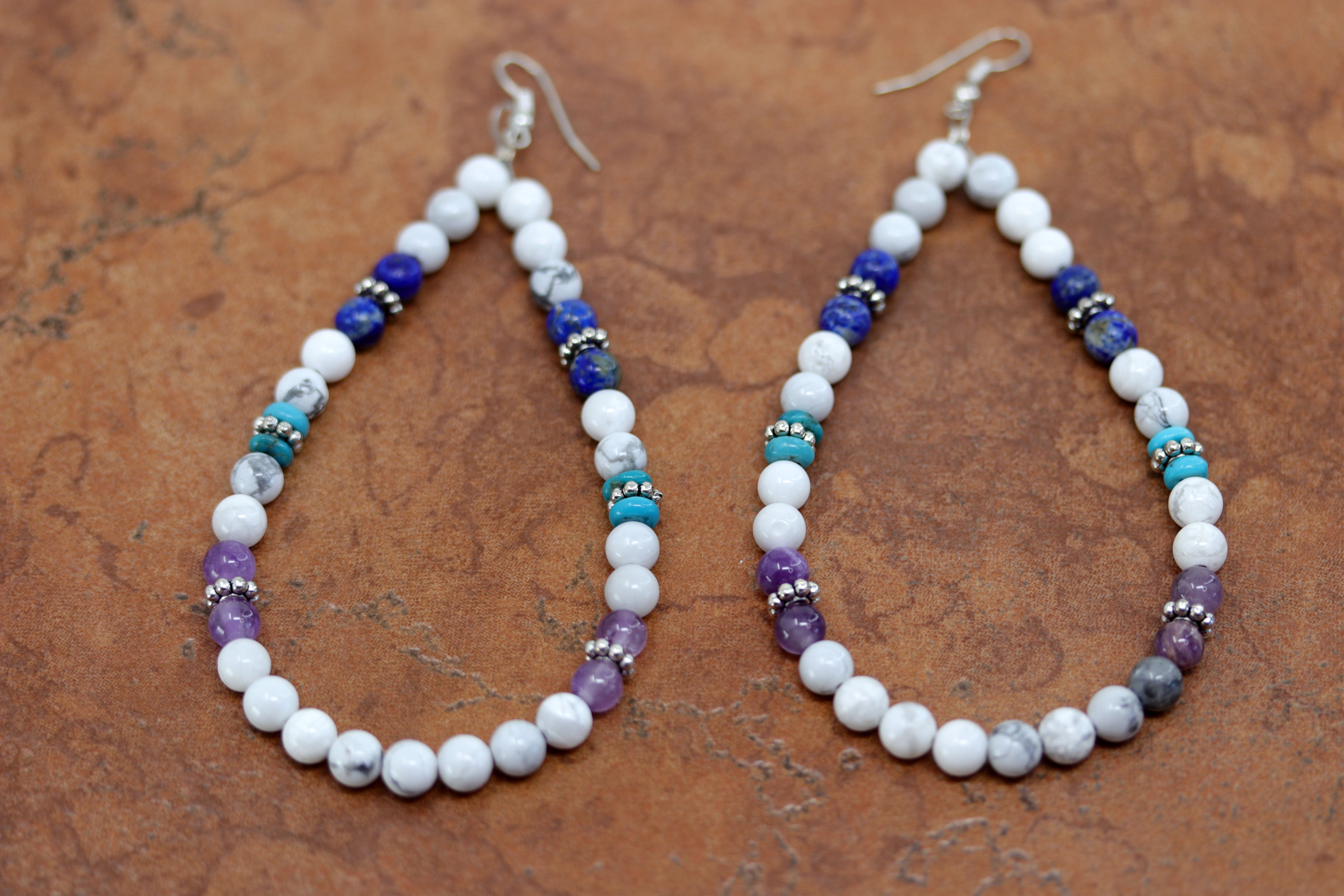 A beautiful Navajo Native American earrings. They are made from sterling silver, amethyst, denim lapis, turquoise, and howlite. The earrings are about 4 3/4" in length including the hook and 3/8" wide.