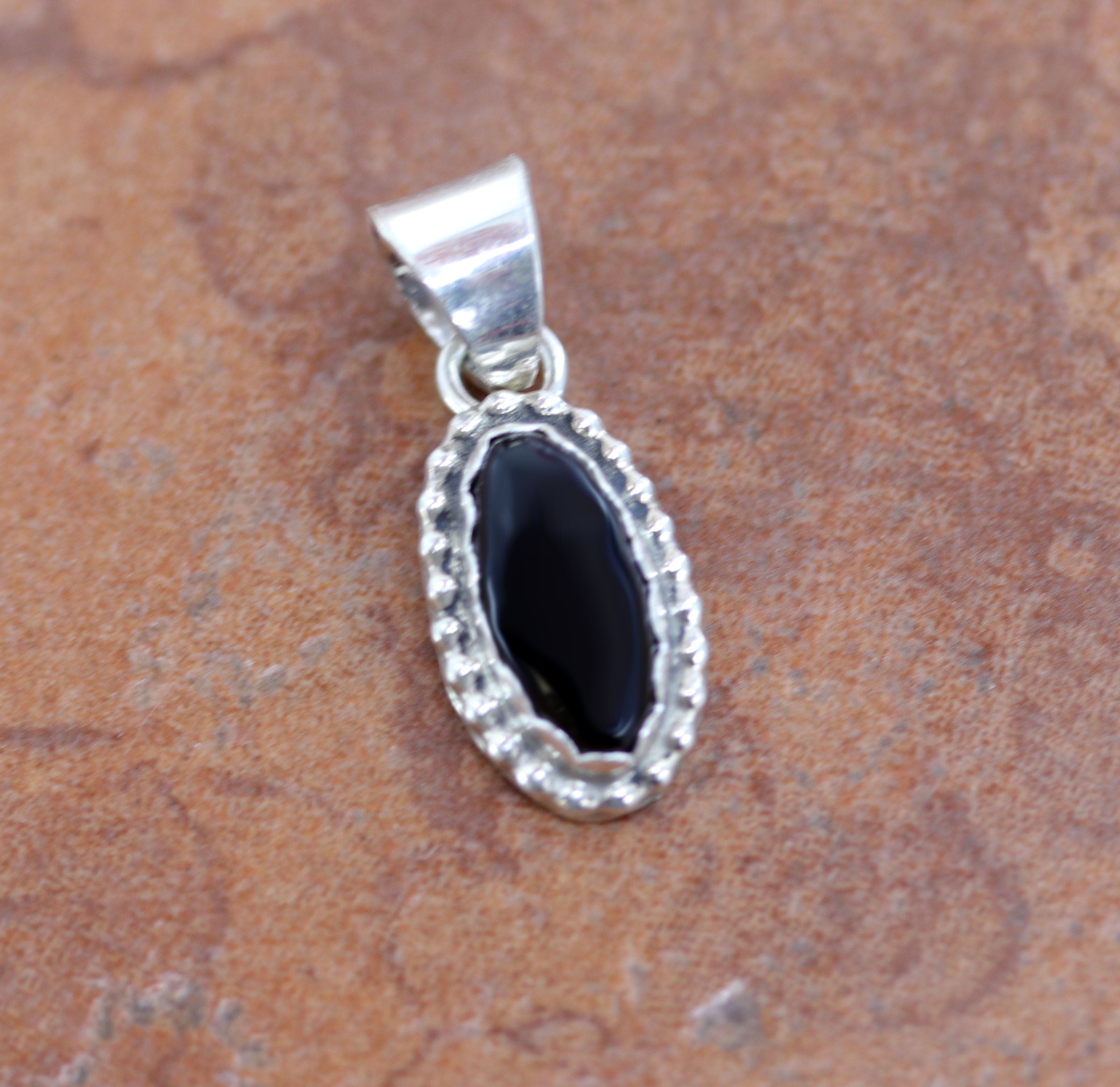 It is made from sterling silver and onyx. The pendant is about 1 1/4" in length and 7/16" in width.