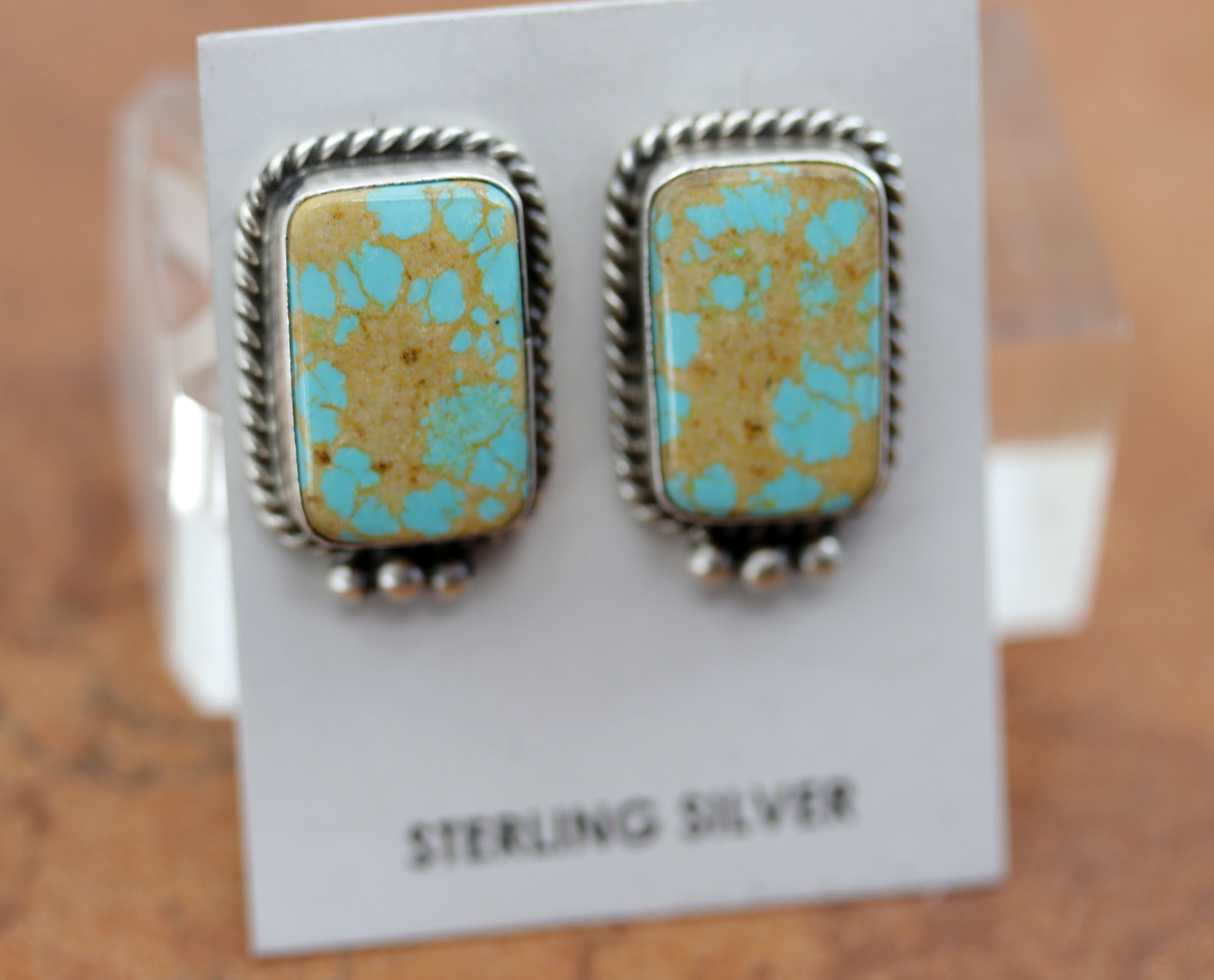 Beautiful Navajo earrings. They are made from sterling silver and royston turquoise. The earrings are about 1 1/8" in length and 3/4" in width.