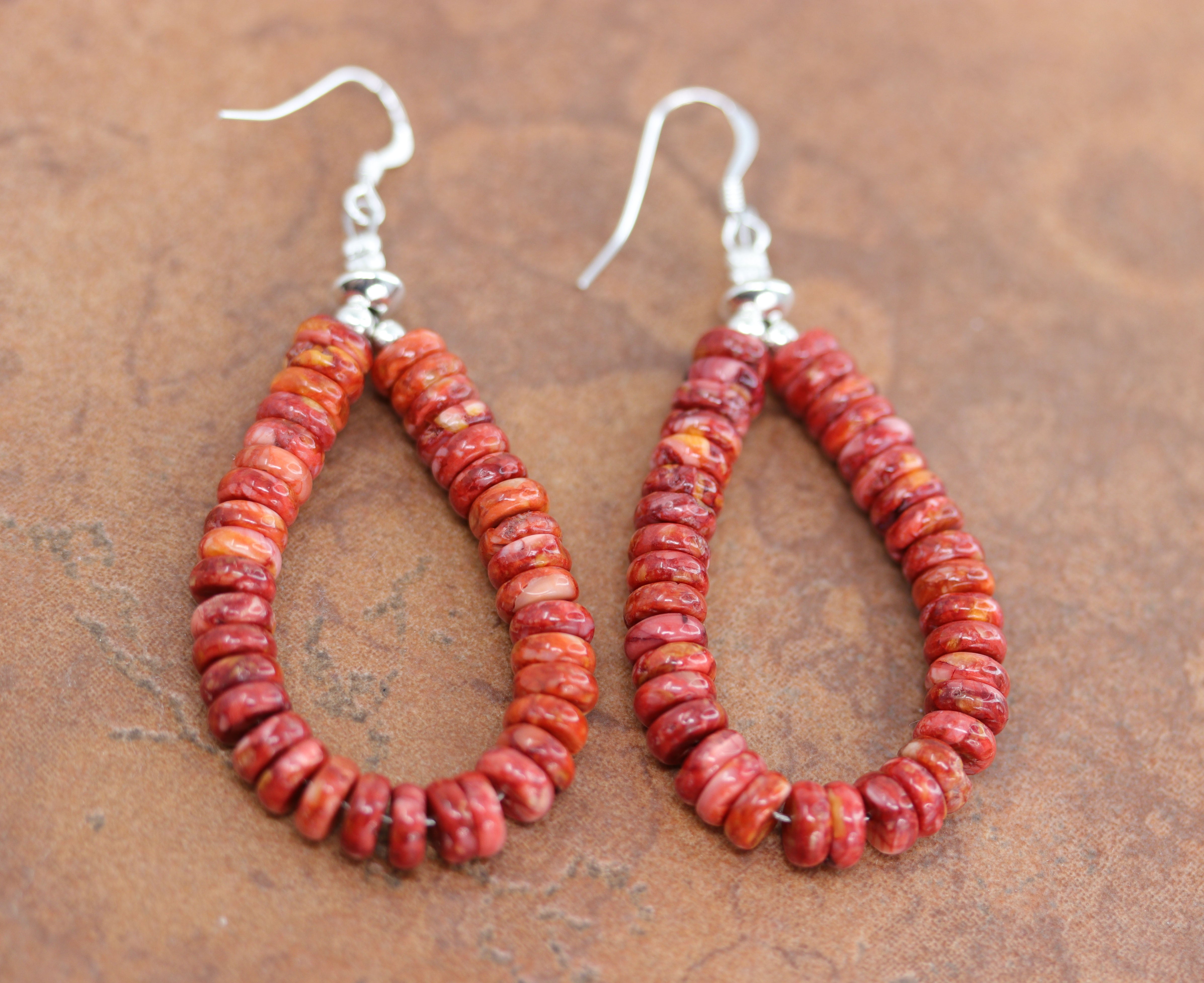 Navajo Native American post earrings by Eloise Joe. They are made from sterling silver and spiny oyster. The earrings are about 2 3/4" in length and 5/16" wide.