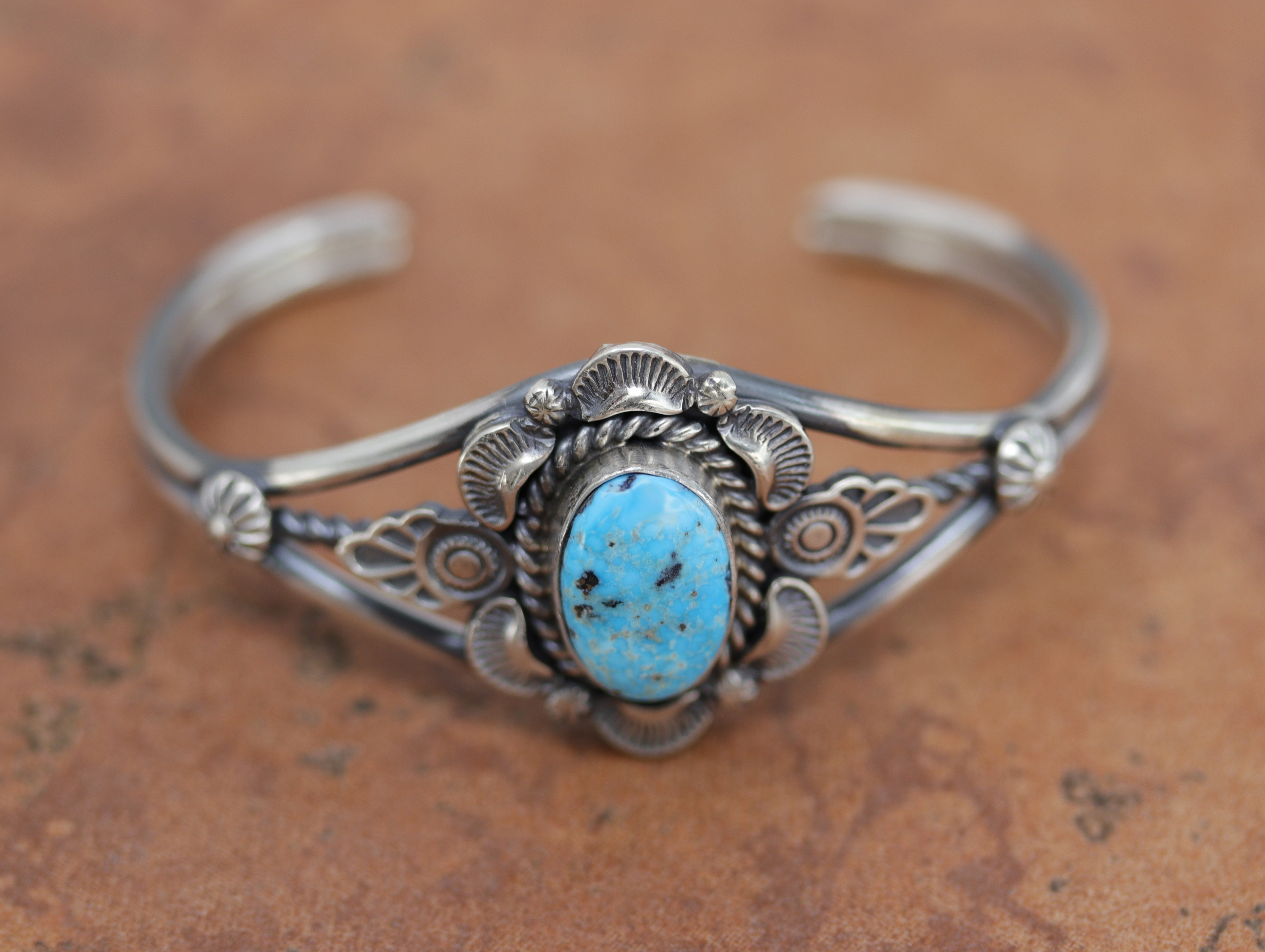 Beautiful Navajo Native American bracelet by R Shakey. It is made from sterling silver and turquoise. It is about 5 1/2" around and 1 1/4" wide. The opening is about 1", and partly flexible.