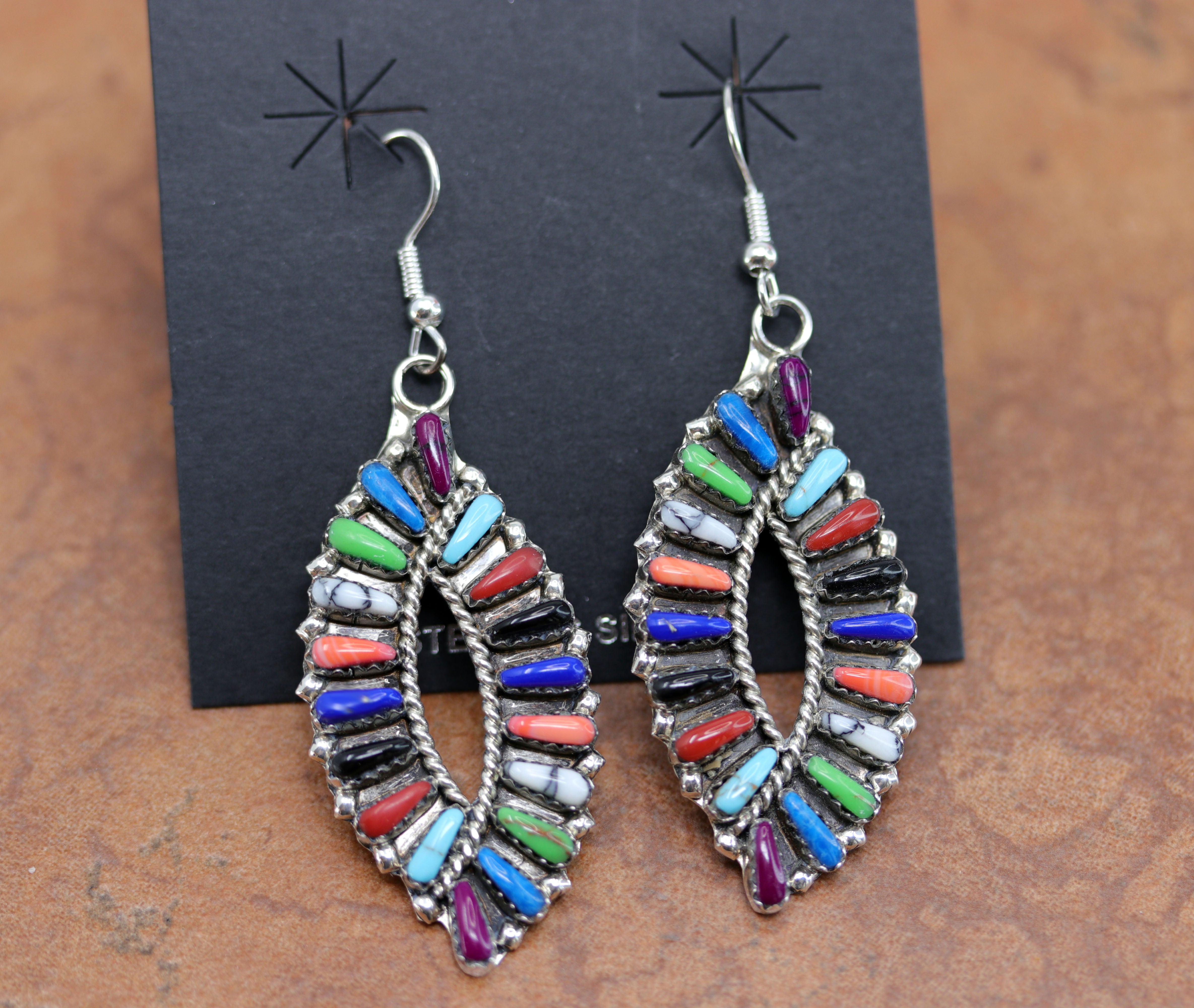 Authentic and beautiful Navajo Native American cluster earrings. They are made from sterling silver and man made multi-stone inlay. The earrings measure 2 1/2" in length including the hook and 1" in width.