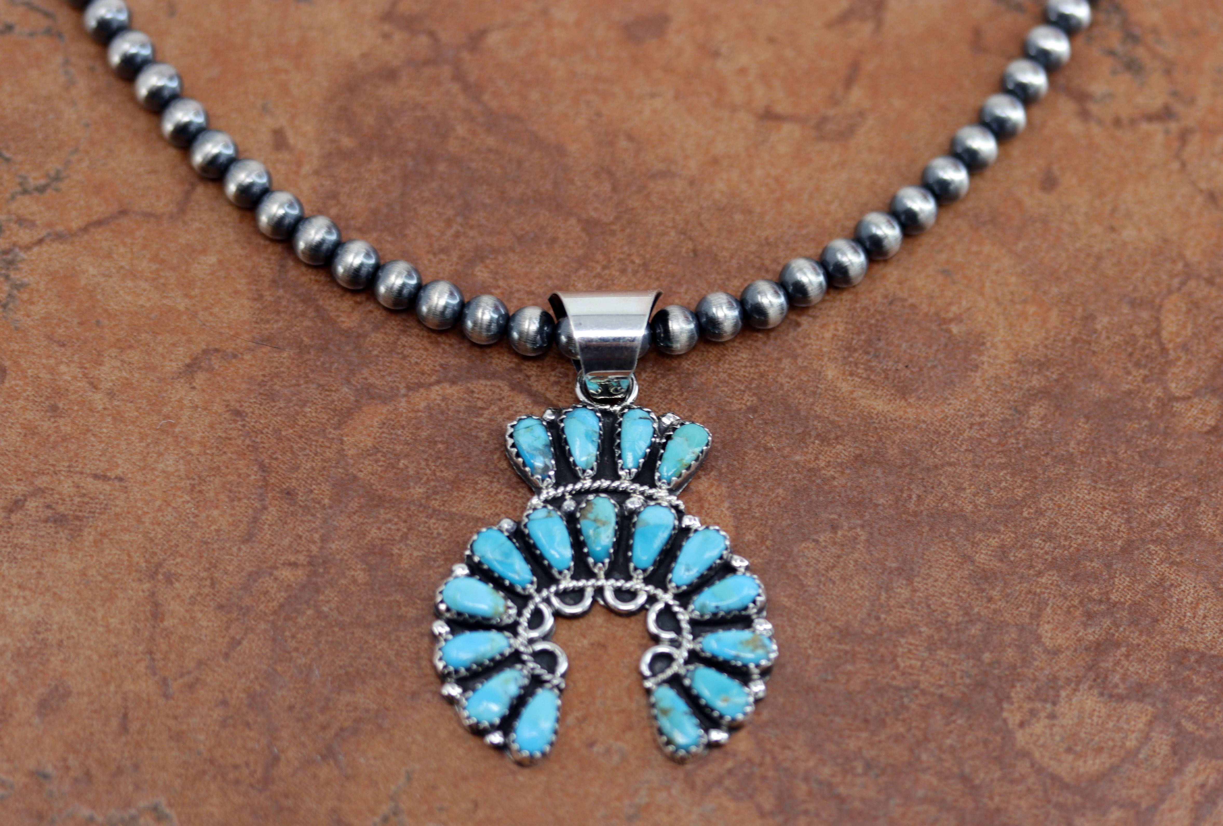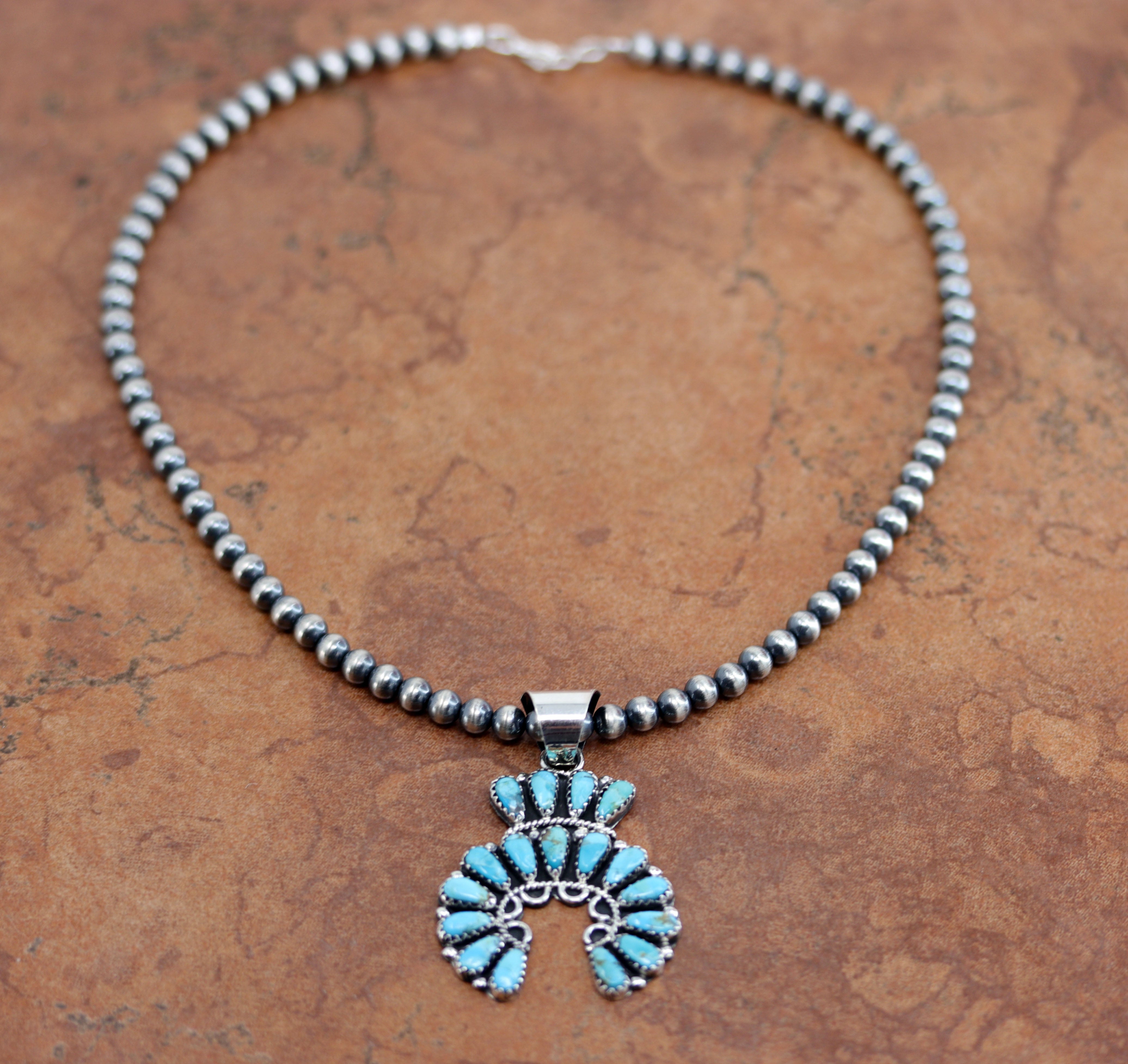 A beautiful Navajo Native American Navajo Pearl Necklace. It is made from sterling silver and turquoise. It is 1 5/8" long. The necklace measures 16" in length.