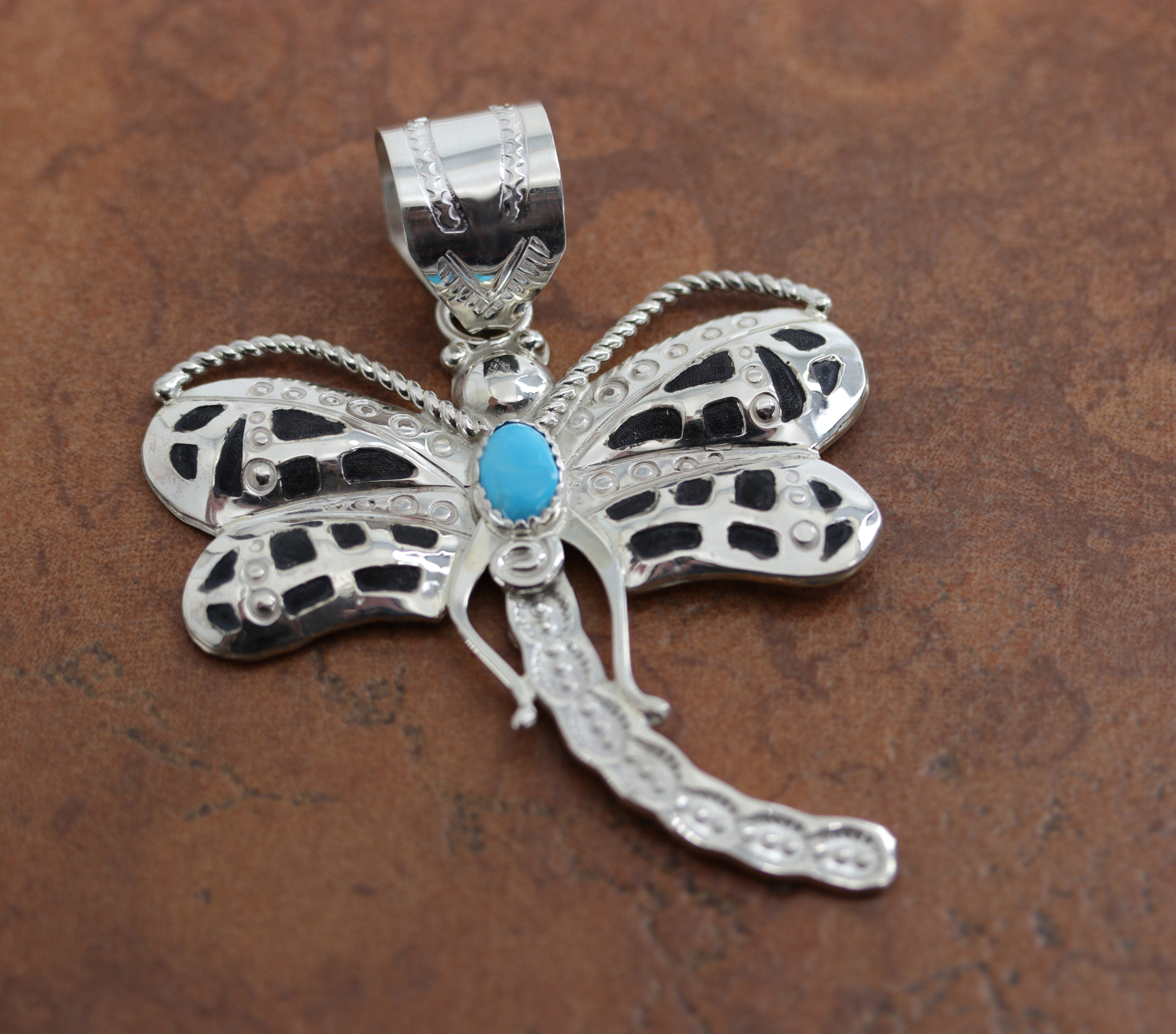 A beautiful Navajo Native American Pendant. It is made from sterling silver and turquoise. It is about 3 1/8" in length including the bail and 2 3/8" in width.