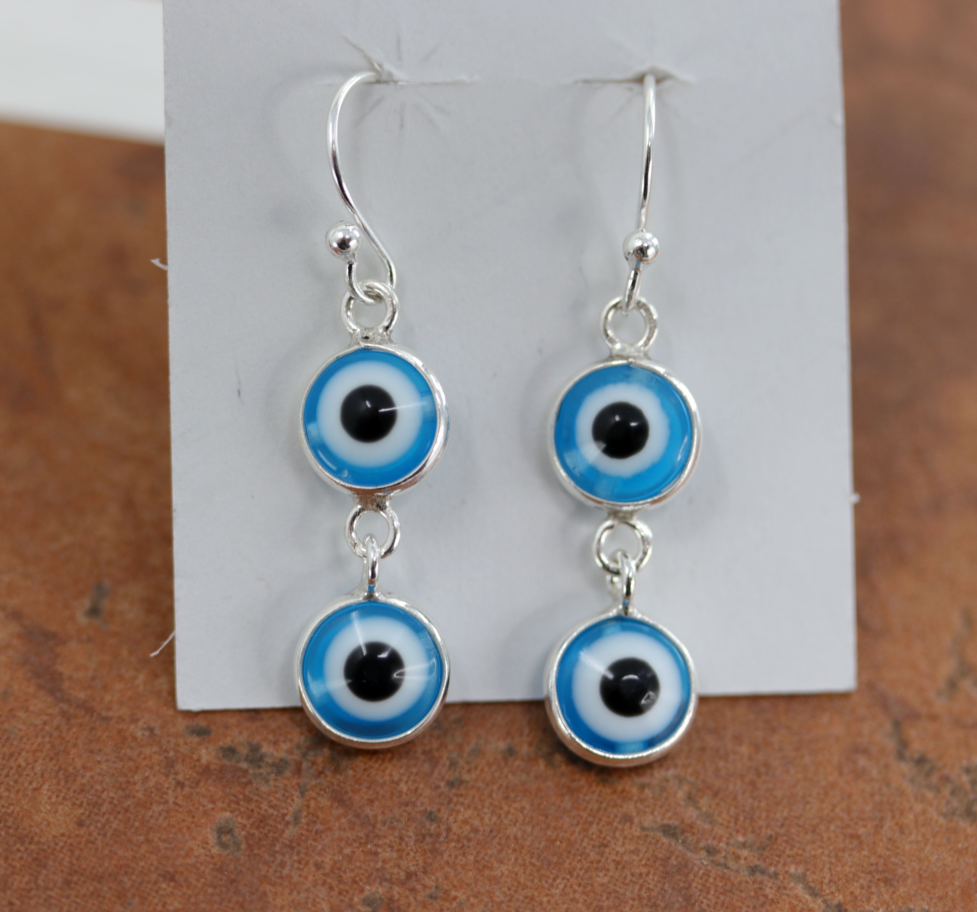 Beautiful blue evil eye hook earrings. The length is 1 5/8" in length and 3/8" in width. This item is not Native American made.