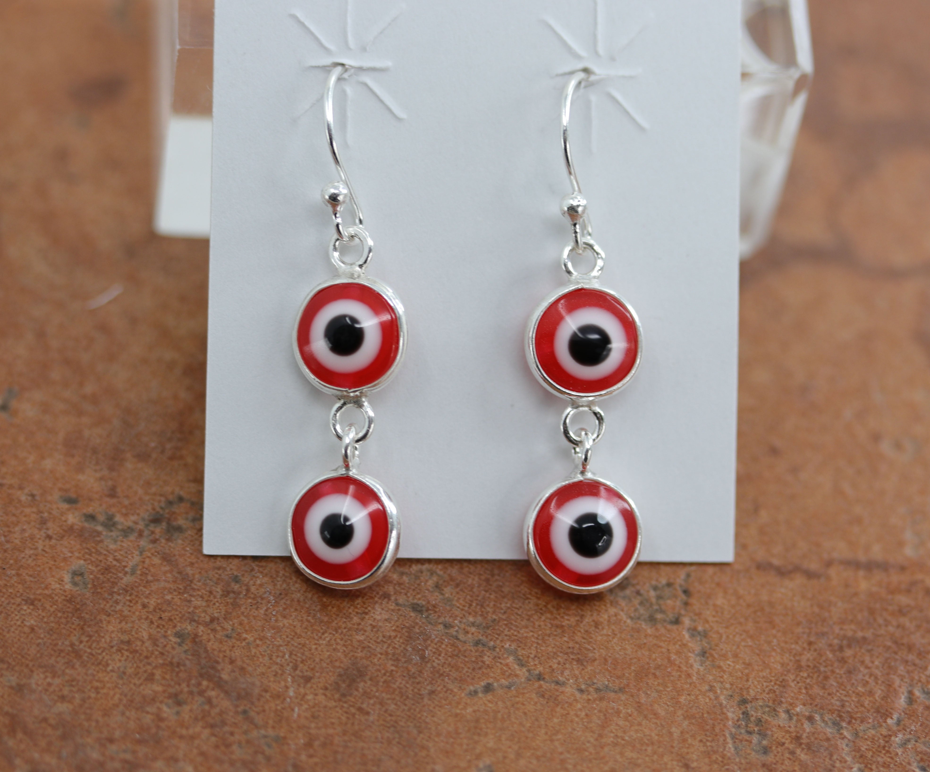 Beautiful red evil eye hook earrings. The length is 1 5/8" in length and 3/8" in width. This item is not Native American made.