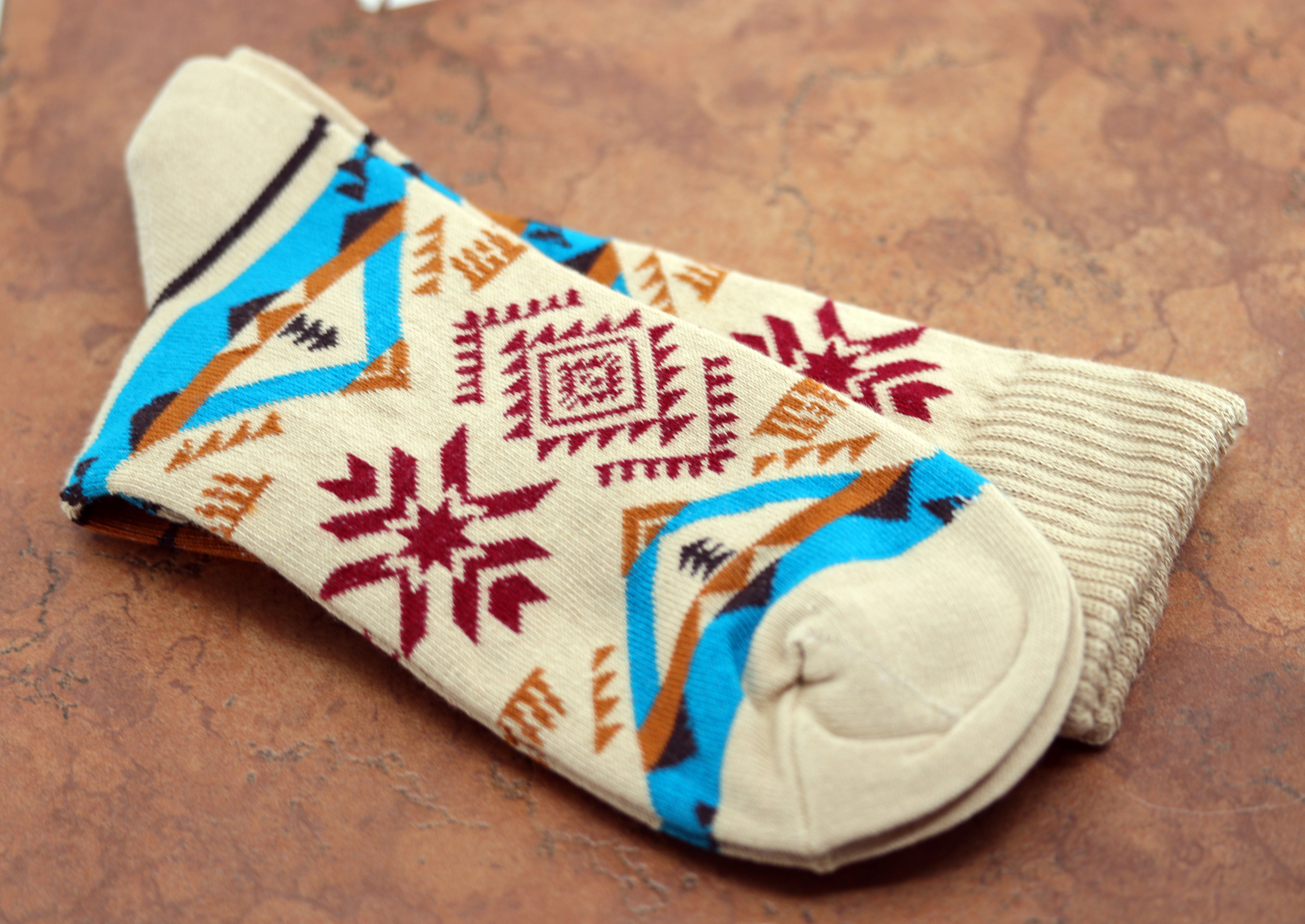A beautiful pair of soft southwest pattern rug style socks. This item is not Native American.