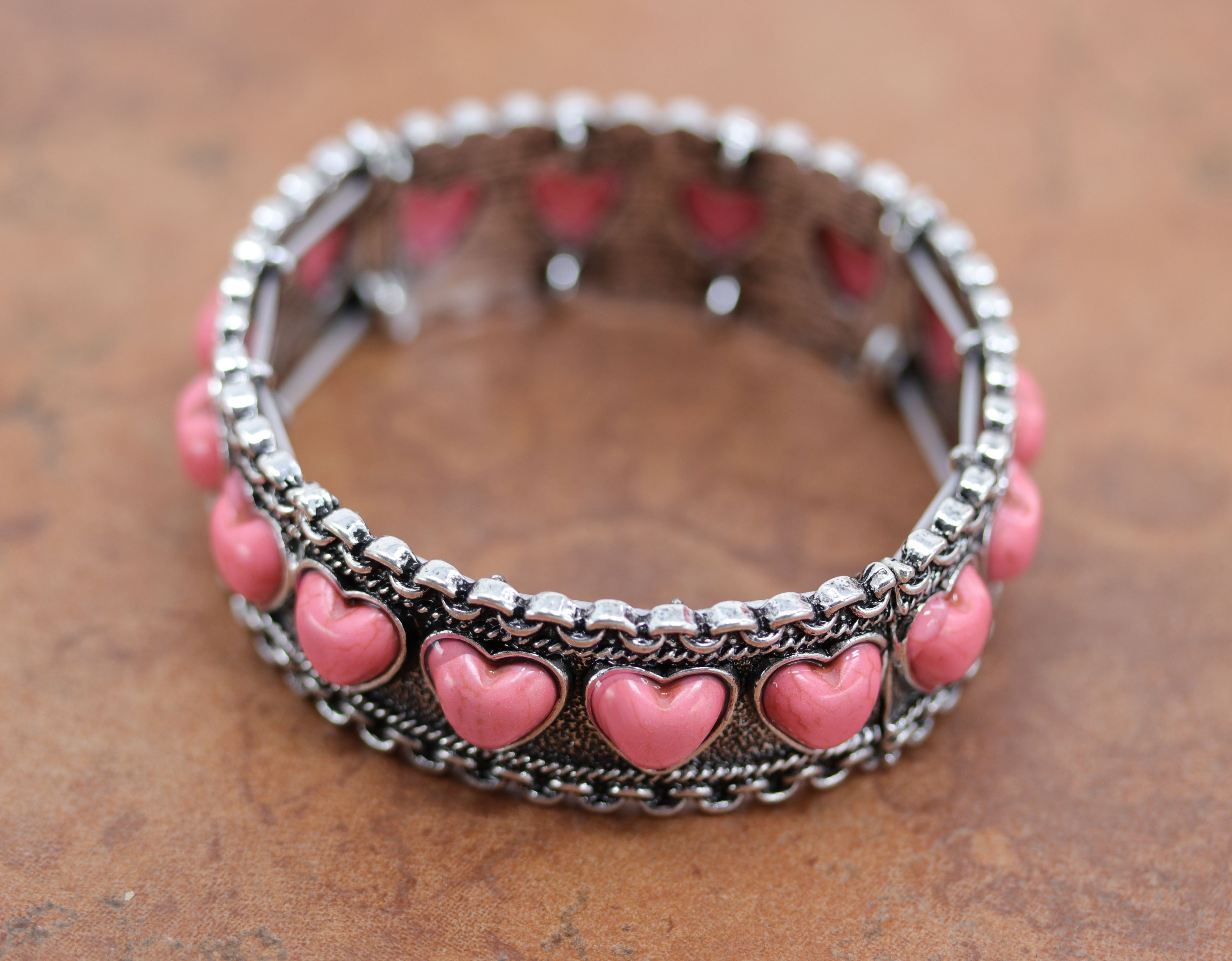 This stretch bracelet is made from Zinc Alloy and man made pink quartz. The bracelet is stretchy and fits most sizes and the width is 7/8". This item is not Native American.
