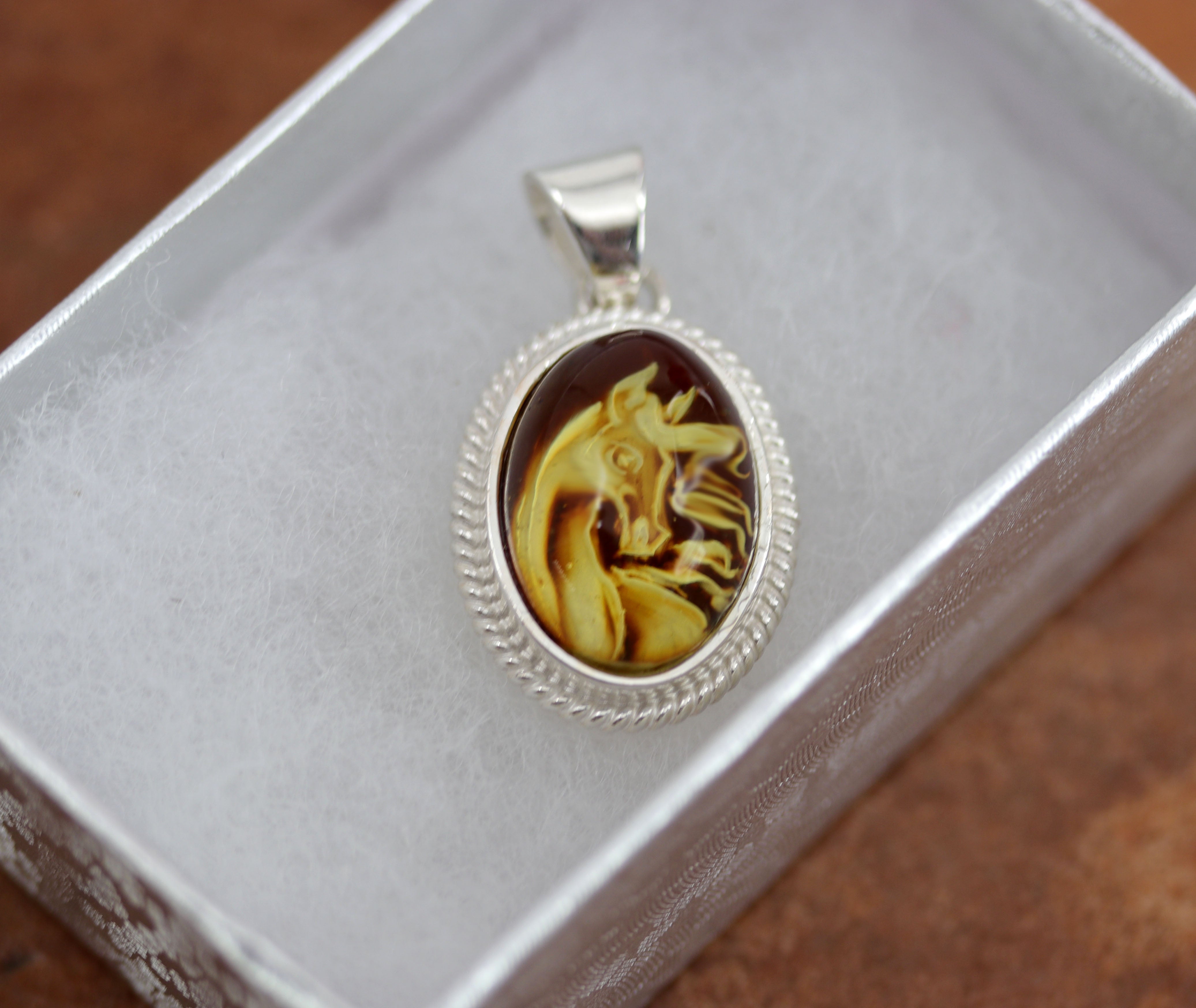A beautiful hand carved pendant. It is made from sterling silver and Baltic amber. The pendant is 1 1/4" in length including the hook, and 3/4" in width. This item is not Native American.