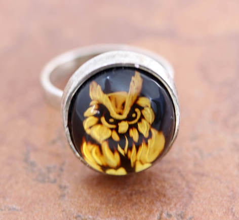 Sterling Baltic Amber Cameo Owl Ring Size 9-11