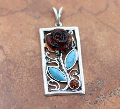 Sterling Silver Baltic Amber Turquoise Rose Pendant