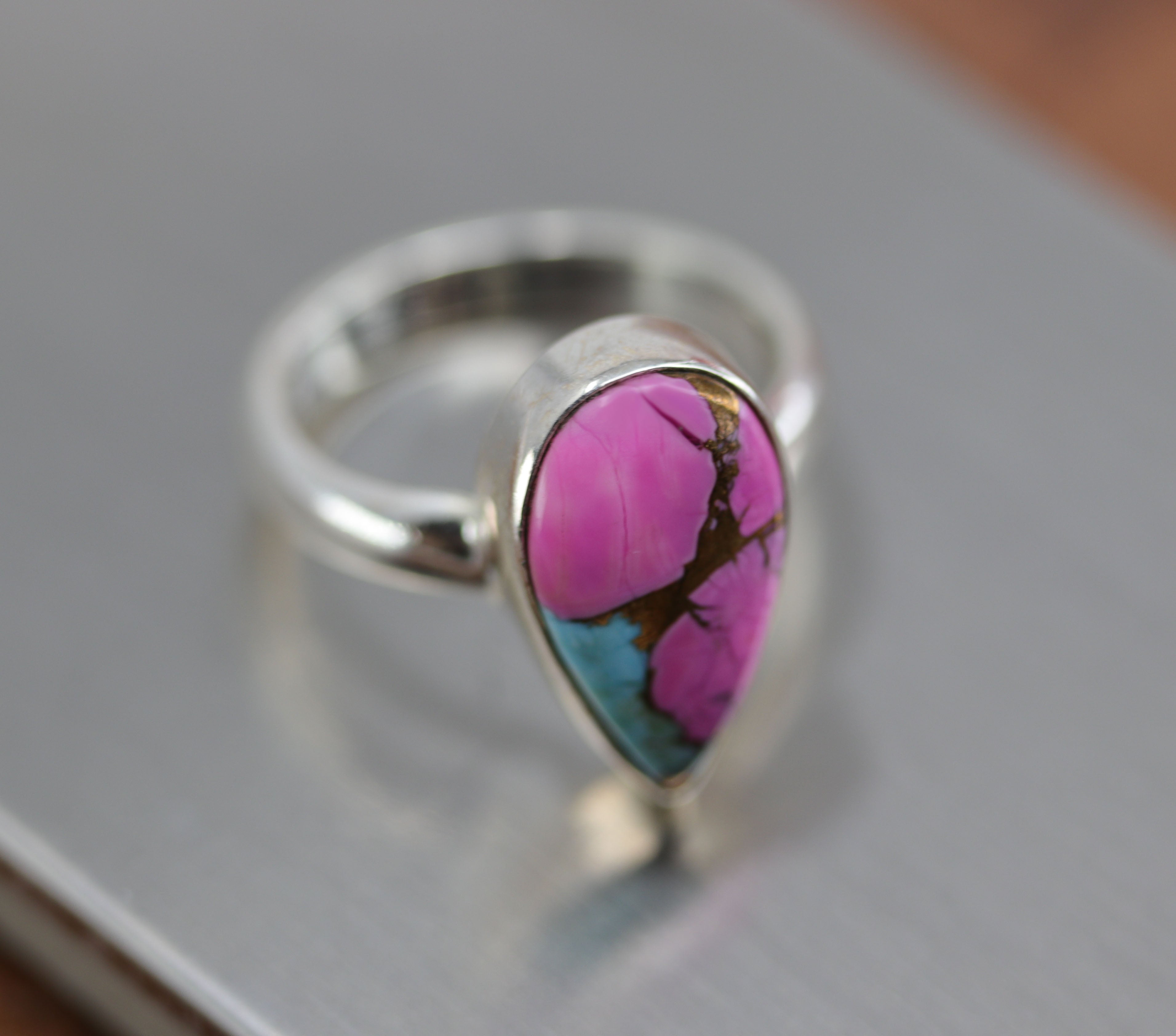 A beautiful Southwest Style gemstone ring made from sterling silver and cotton candy dahlia turquoise. The ring size is 6 and it is 3/4" in length. This item is not Native American.