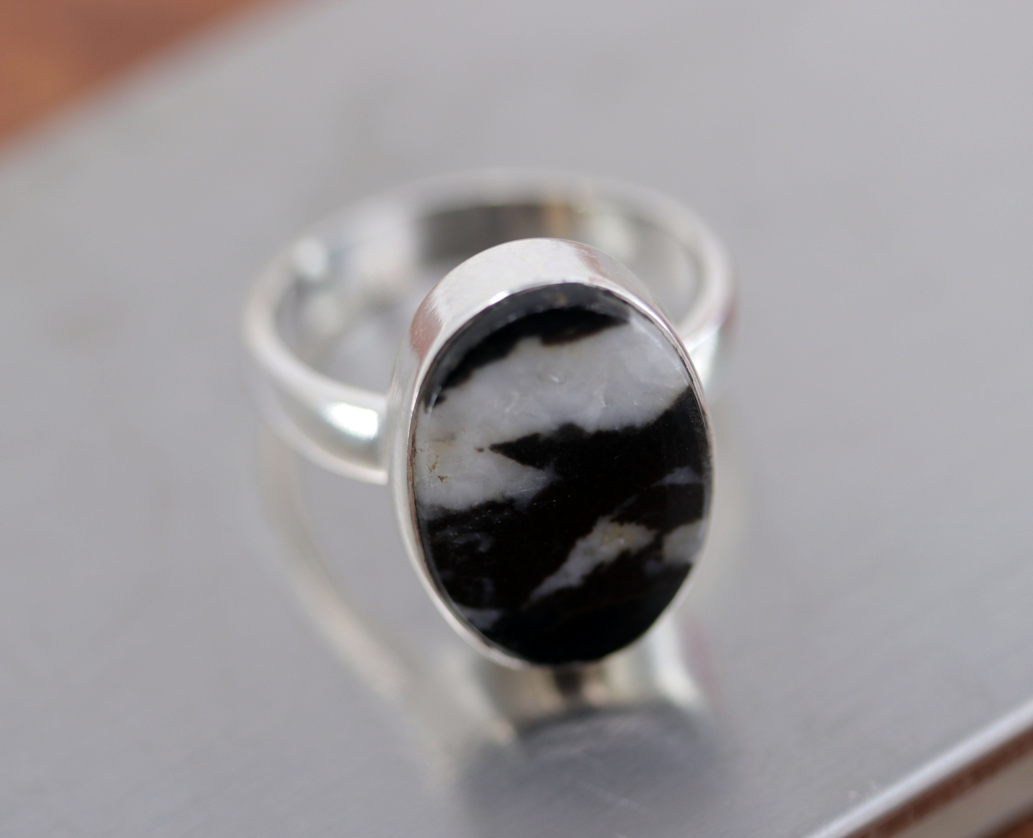 A beautiful Southwest Style black and white gemstone ring made from sterling silver and dendritic agate. The ring size is 6 and it is 3/4" in length. This item is not Native American.