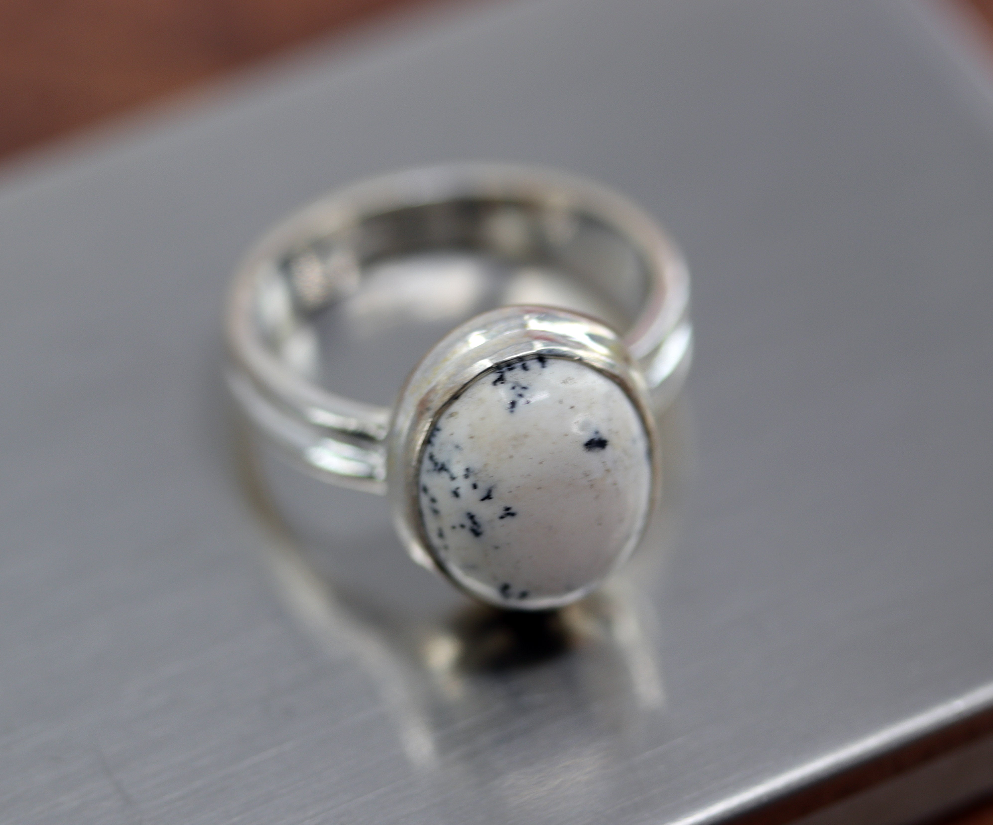 A beautiful Southwest Style black and white gemstone ring made from sterling silver and dendritic agate. The ring size is 7 and it is 5/8" in length. This item is not Native American.