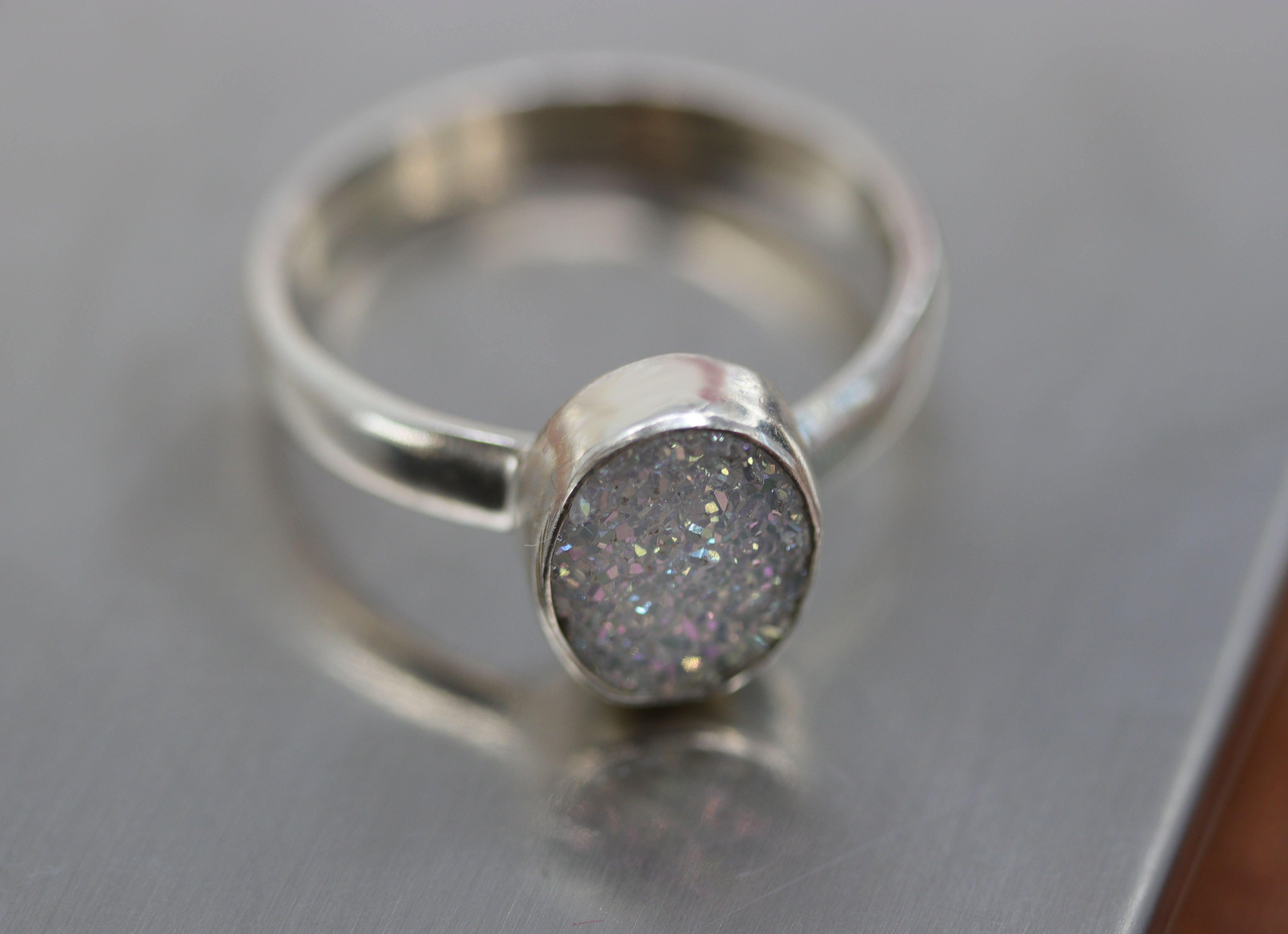 Beautiful ring made from sterling silver and druzy. The ring size is 8 1/2 and it is 1/2" in length. This item is not Native American.