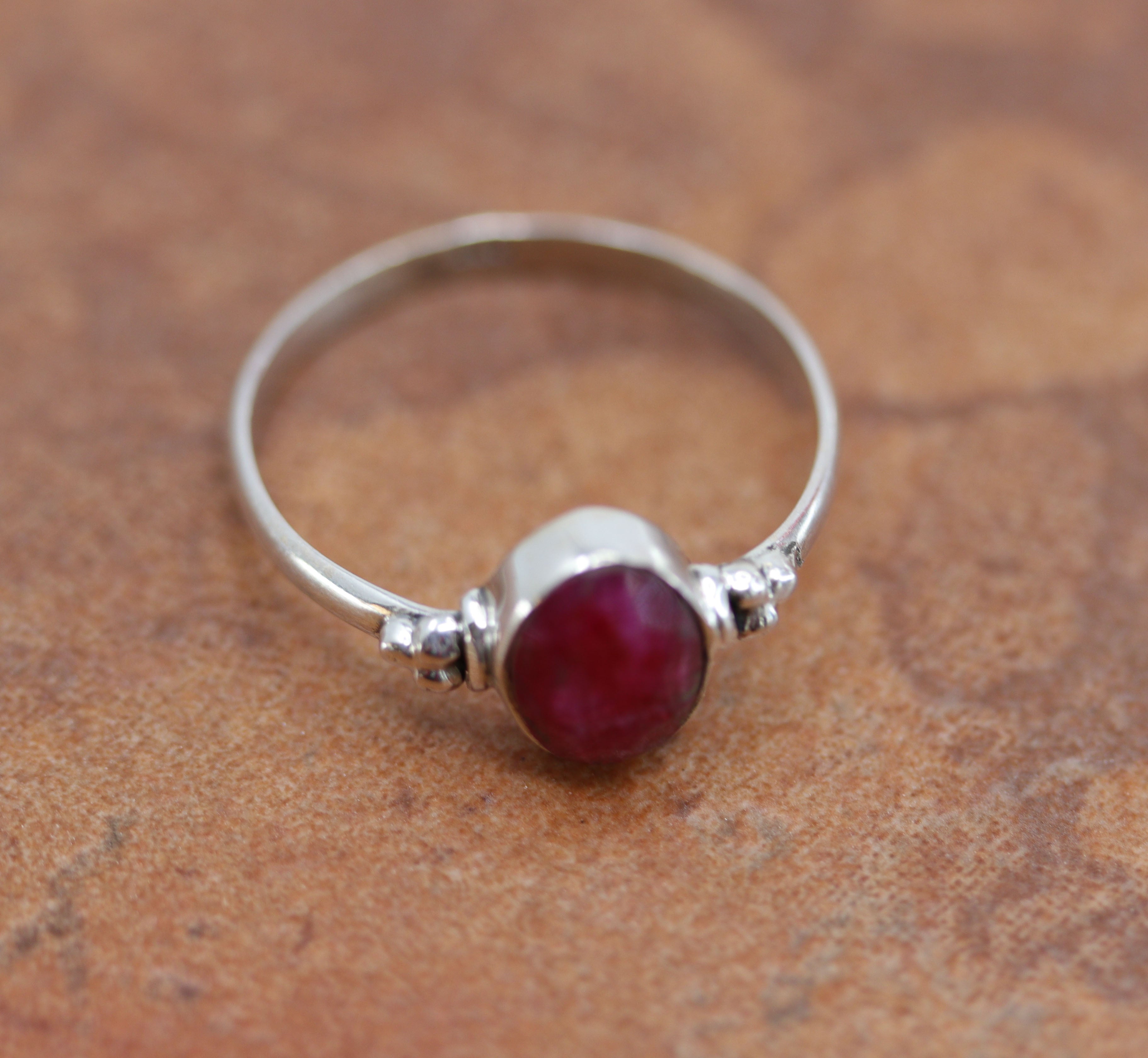A beautiful Southwest Style gemstone ring made from sterling silver and ruby. The ring size is 7 and it is 3/8" in length. This item is not Native American.