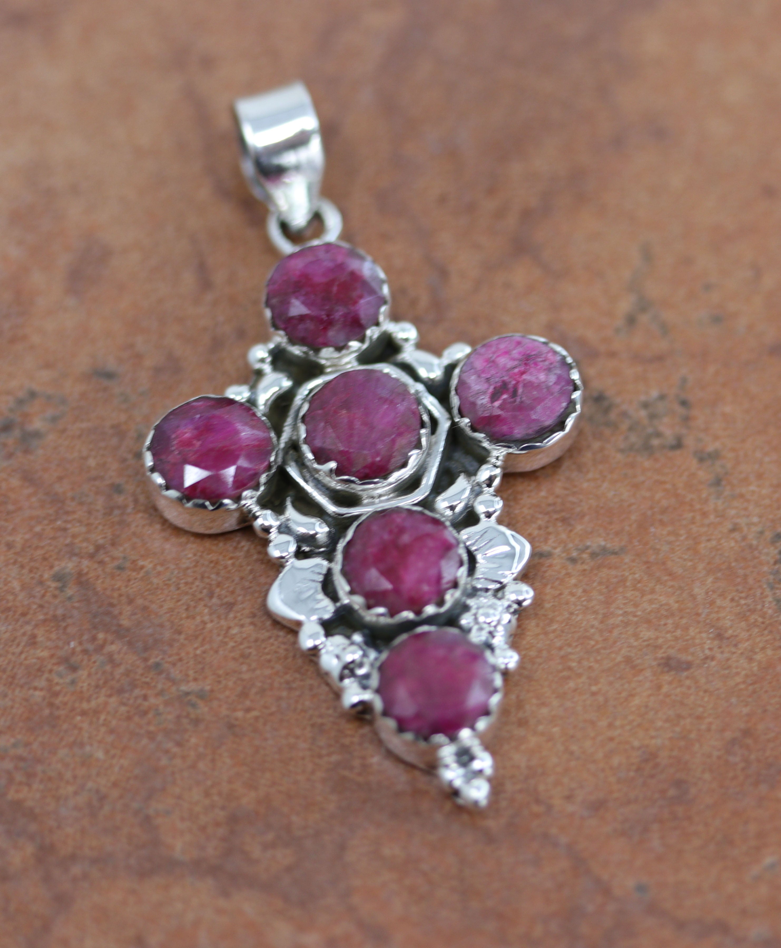 It is made from Sterling Silver and ruby. It is about 2" in length including the bail, and about 1 1/8" in width. This item is not Native American.