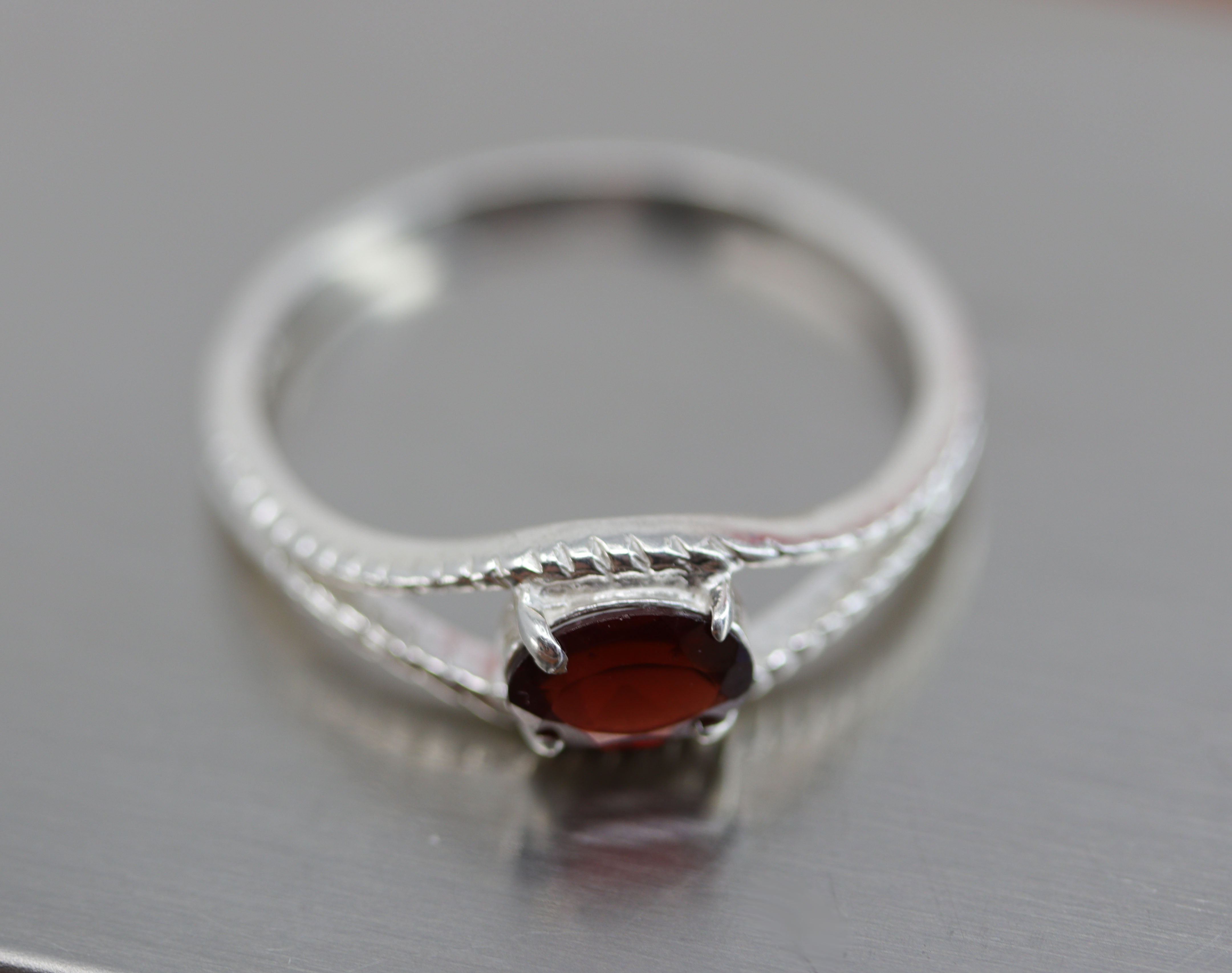 A beautiful Southwest Style gemstone ring made from sterling silver and garnet. The ring size is 10 and it is 5/16" in length. This item is not Native American.