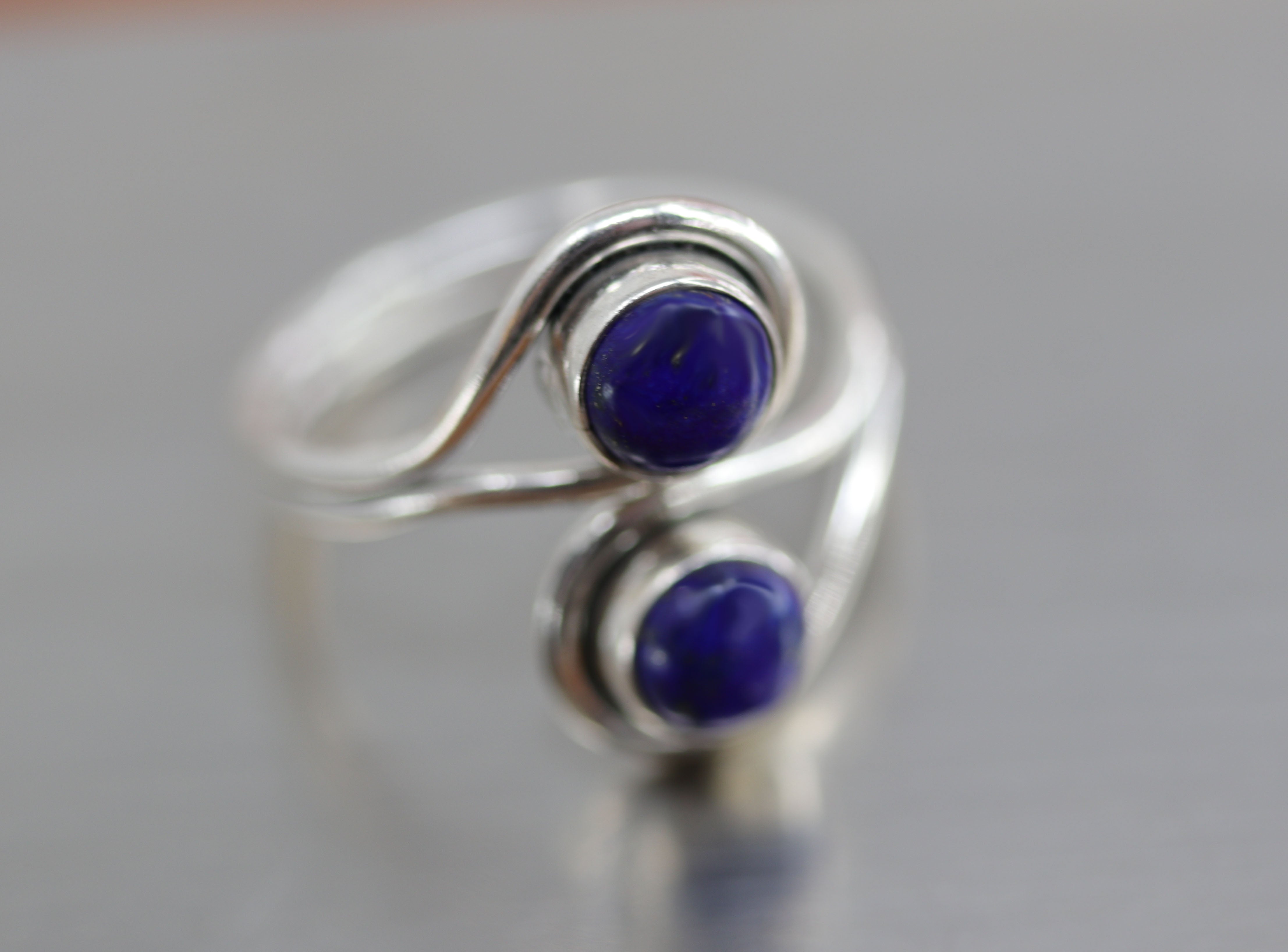 A beautiful Southwest Style gemstone ring made from sterling silver and lapis. The ring size is 8-10 and it is 7/8" in length. This item is not Native American.