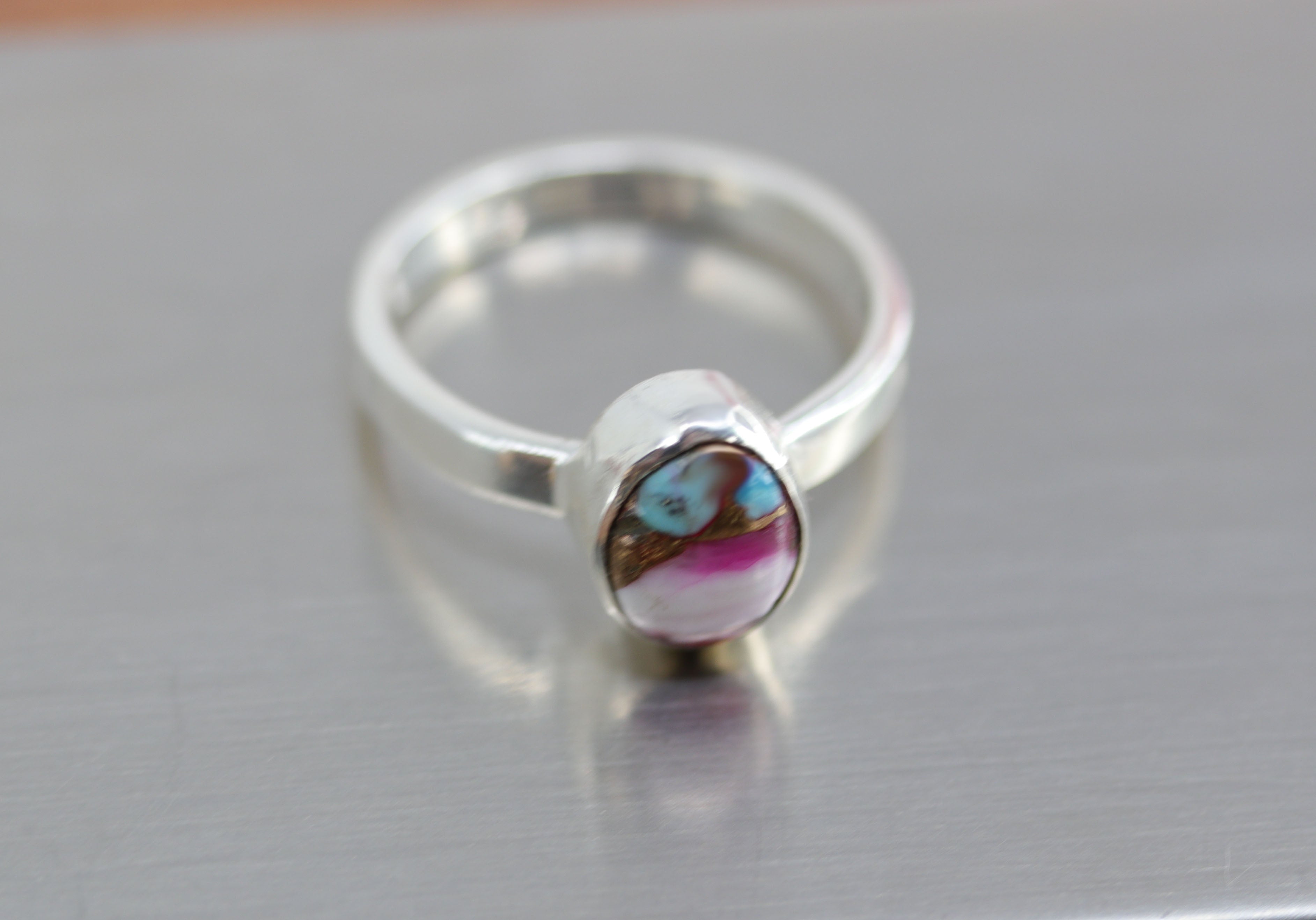 A beautiful Southwest Style gemstone ring made from sterling silver and mojave turquoise. The ring size is 7 and it is 3/8" in length. This item is not Native American