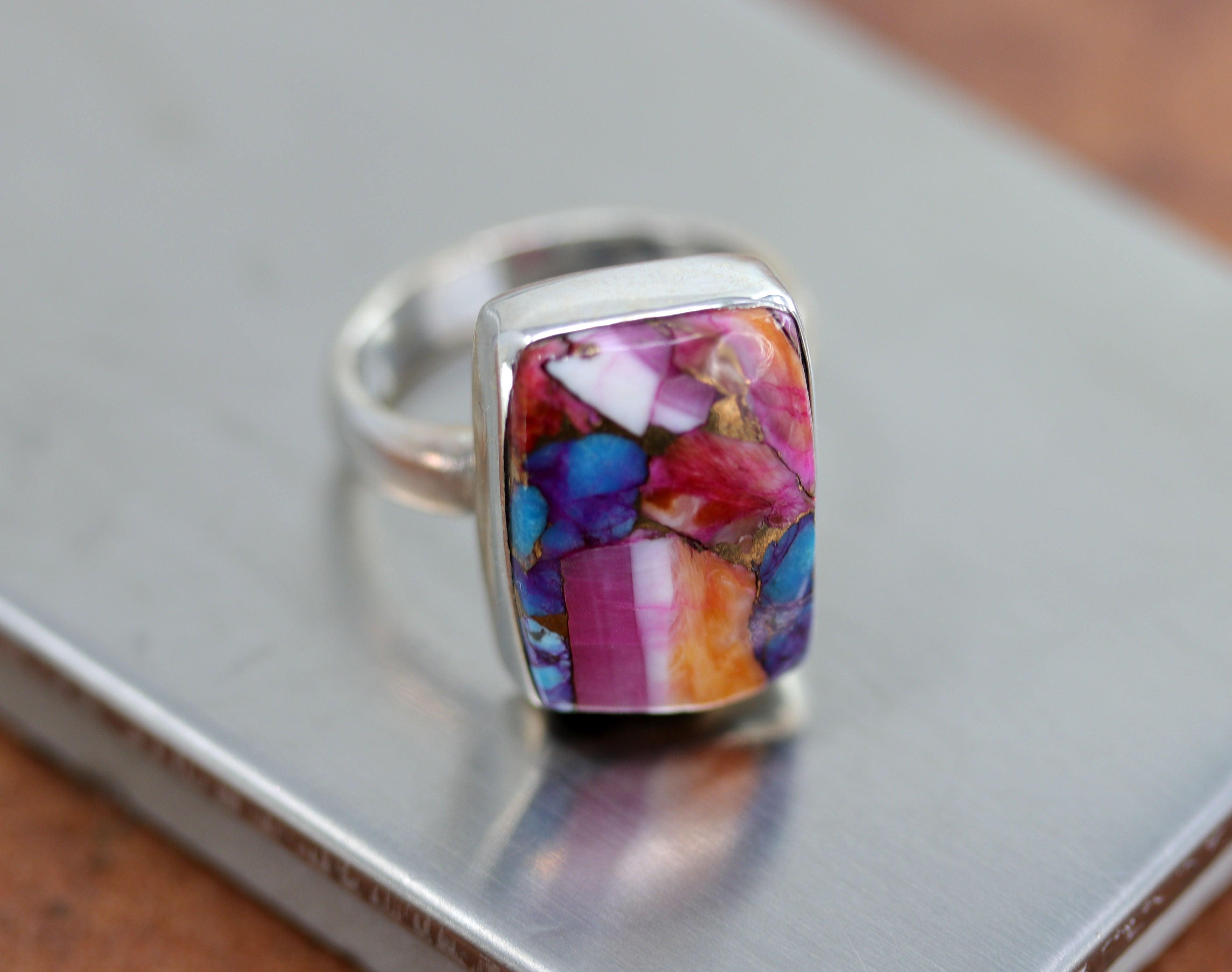 A beautiful Southwest Style gemstone ring made from sterling silver and mojave turquoise. The ring size is 6 and it is 3/4" in length. This item is not Native American.