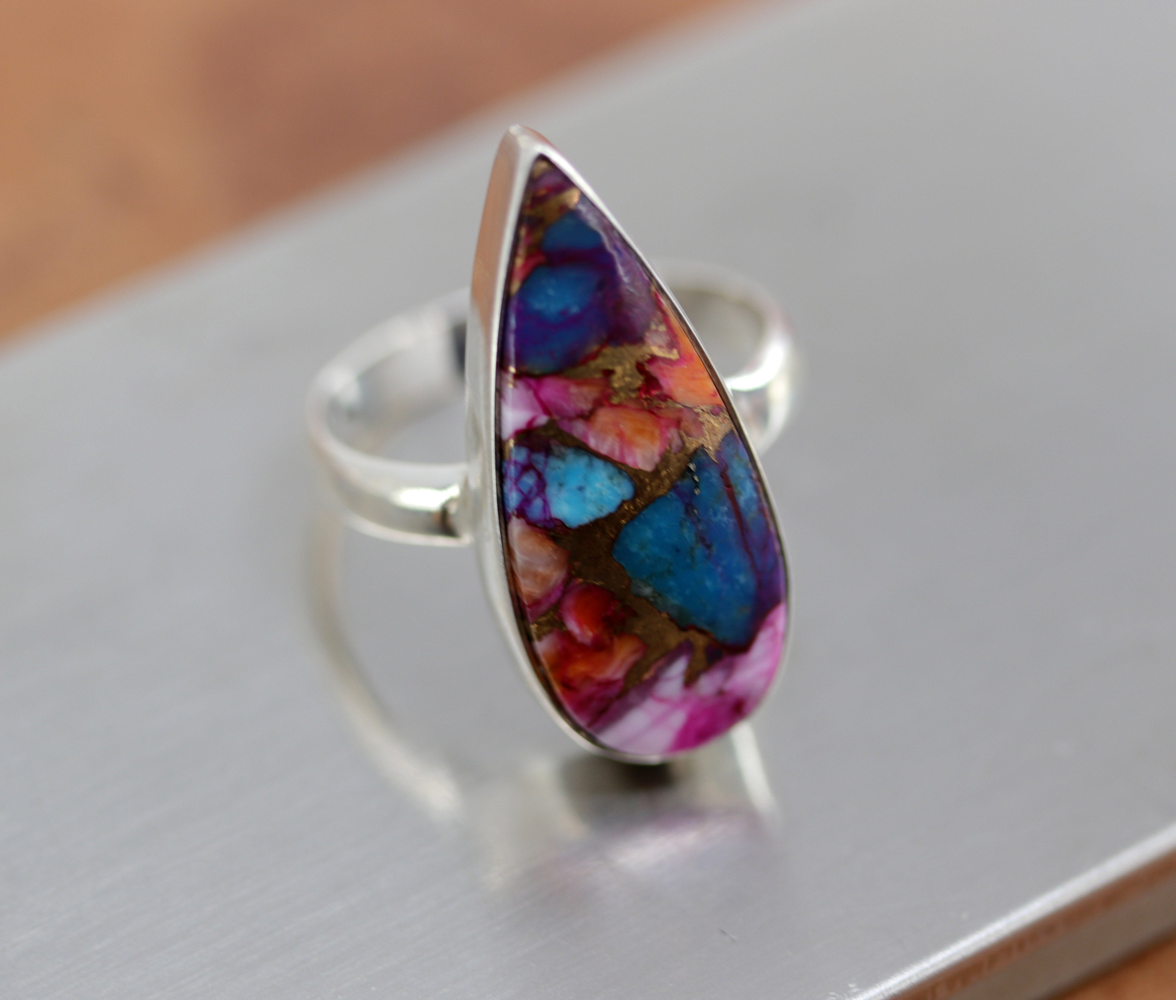A beautiful Southwest Style gemstone ring made from sterling silver and mojave turquoise. The ring size is 7 1/2 and it is 1 1/8" in length. This item is not Native American.