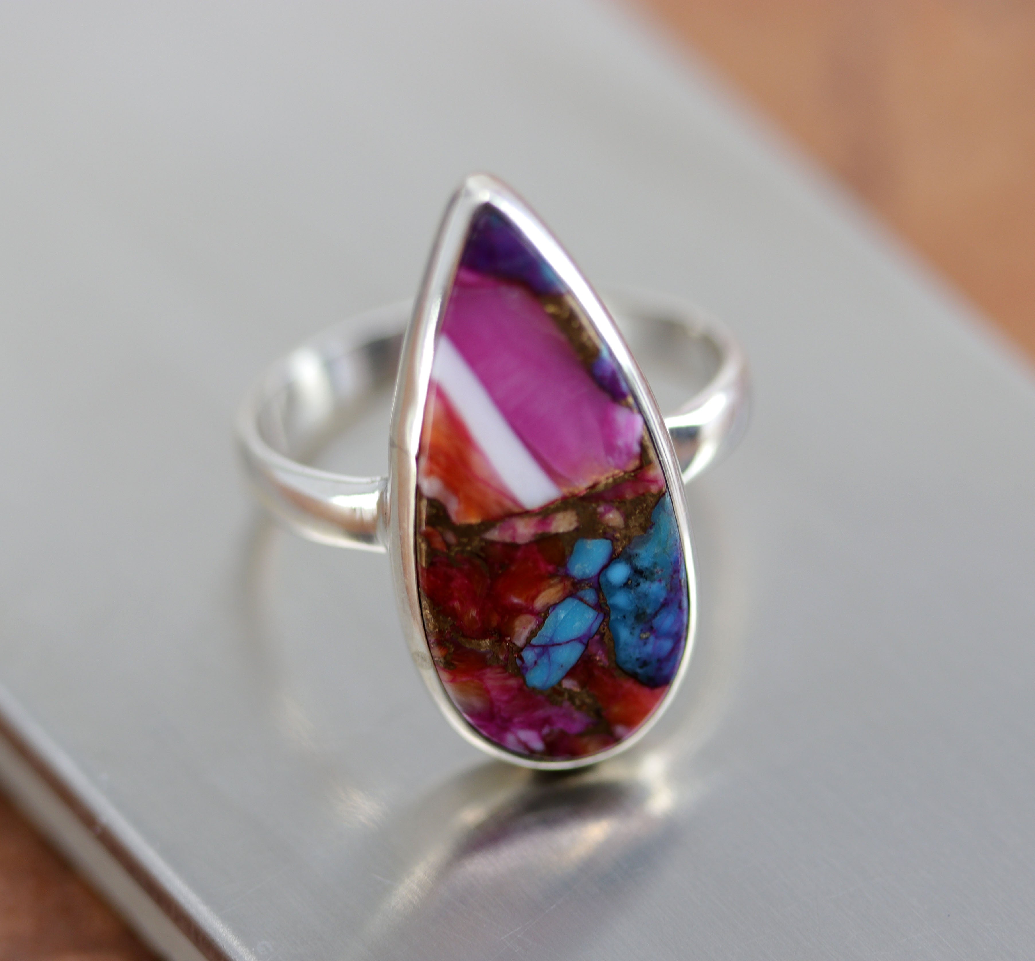A beautiful Southwest Style gemstone ring made from sterling silver and mojave turquoise. The ring size is 9 1/2 and it is 1 1/8" in length. This item is not Native American.