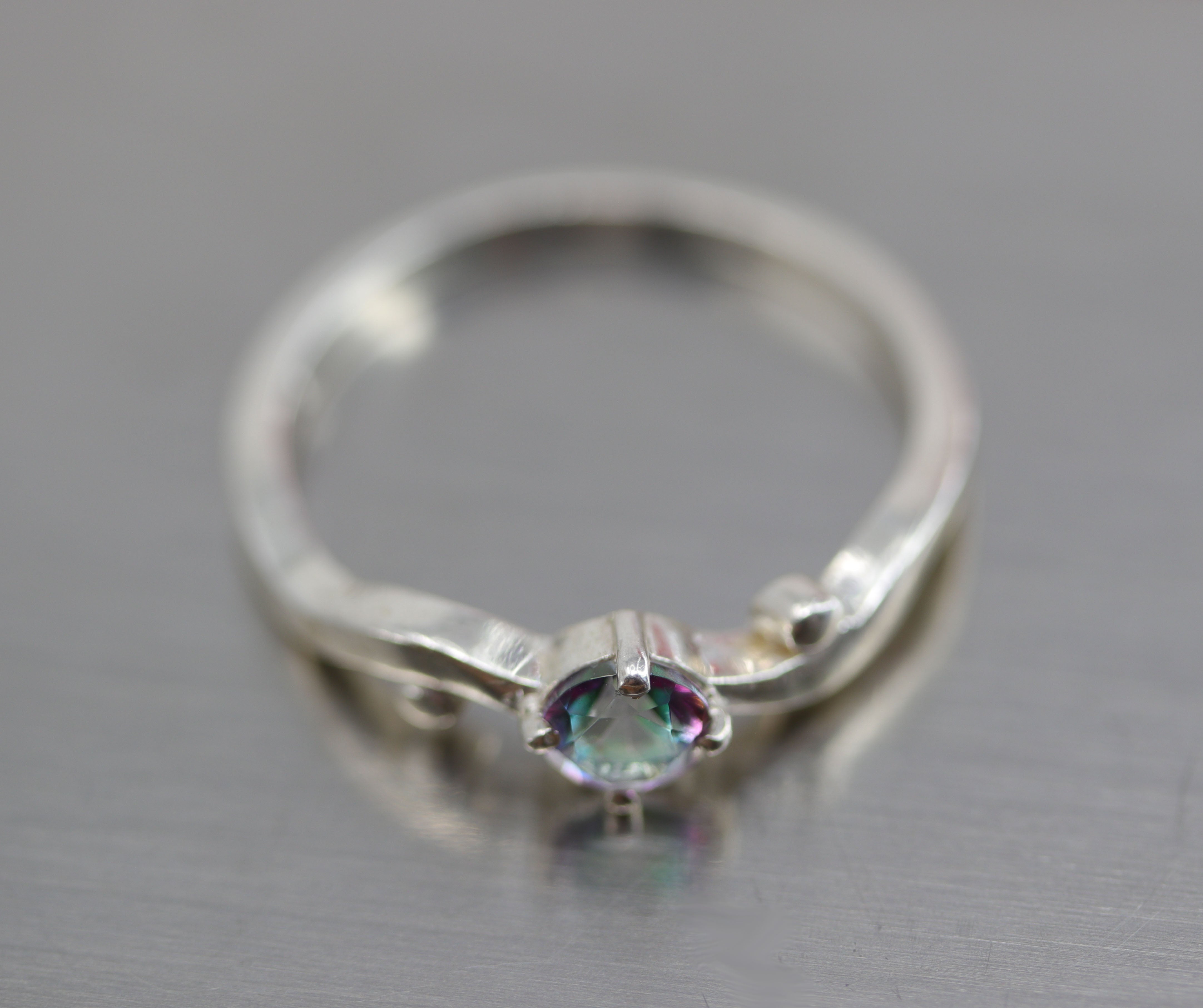 A beautiful Southwest Style gemstone ring made from sterling silver and mystic topaz. The ring size is 9 and it is about 1/4" in length. This item is not Native American.