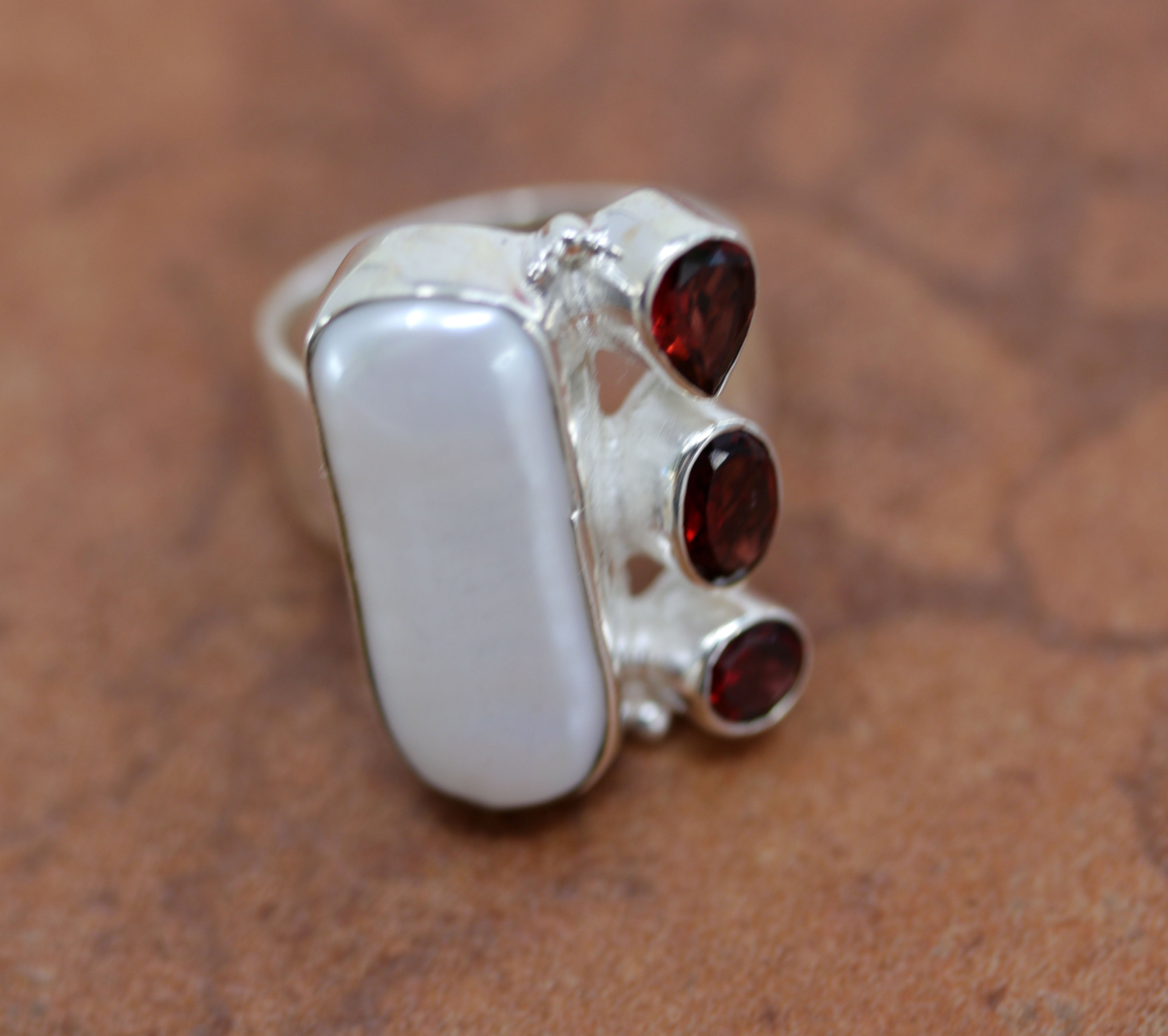 A beautiful Southwest Style gemstone ring made from sterling silver, freshwater pearl, and garnet. The ring size is 7 1/2 and it is 1" in length. This item is not Native American.