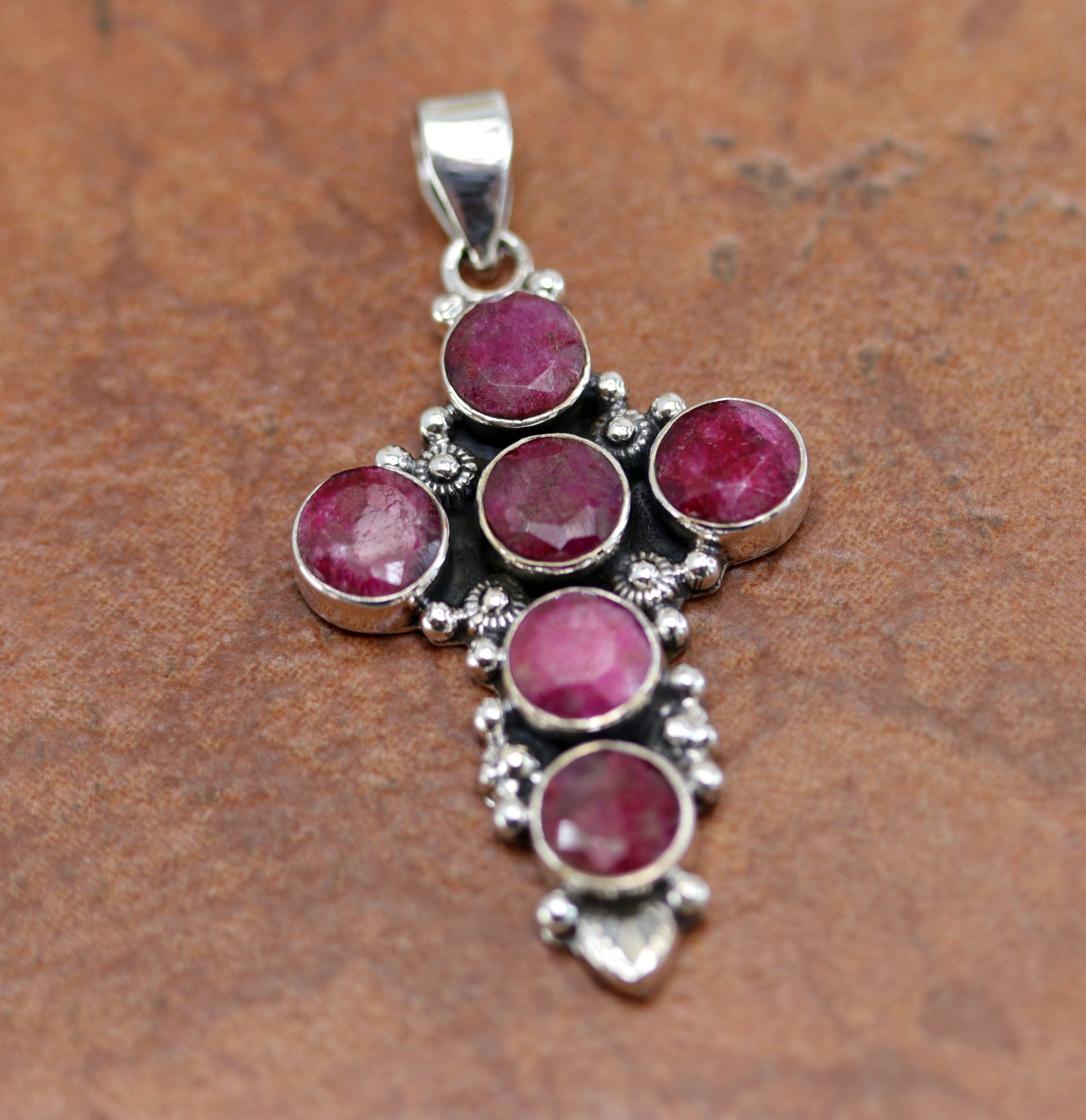 It is made from Sterling Silver and ruby. It is about 2 1/8" in length including the bail, and about 1 1/8" in width. This item is not Native American.