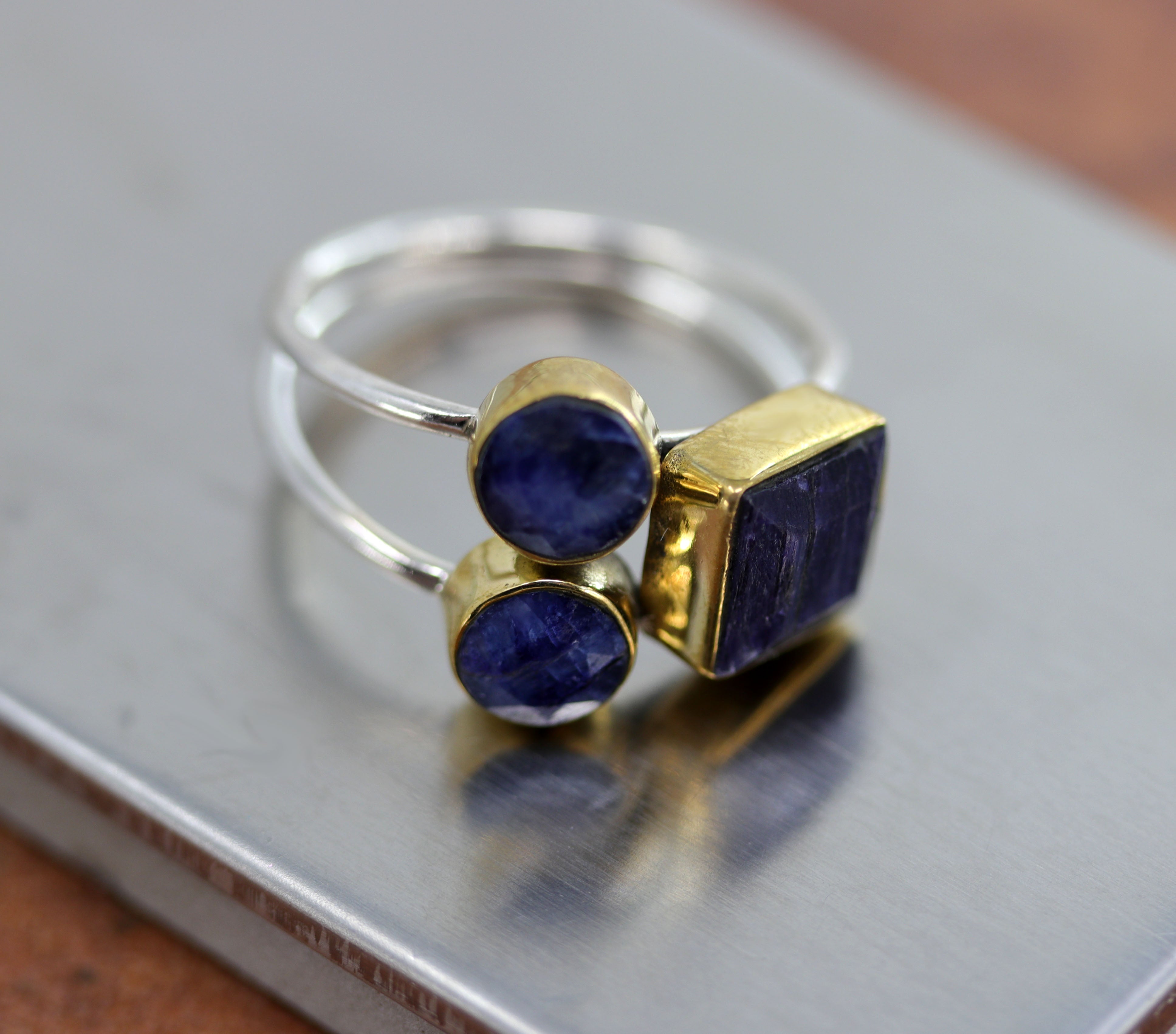 A beautiful Southwest Style gemstone ring made from sterling silver, gold overlay, and sapphire. The ring size is 9 and it is 5/8" in length. This item is not Native American.
