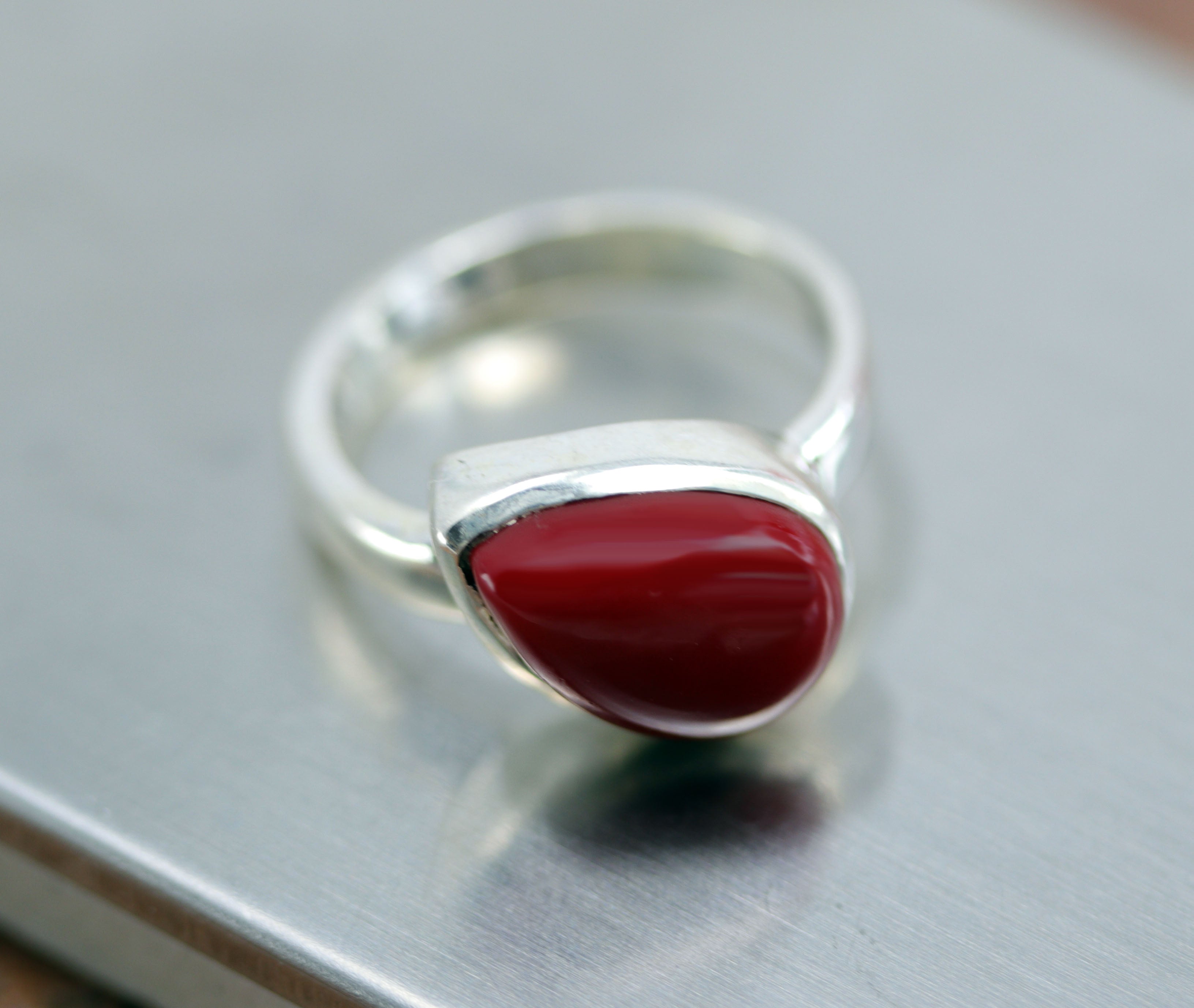 A beautiful Southwest Style gemstone ring made from sterling silver and sponge coral. The ring size is 4 1/2 and it is 5/8" in length. This item is not Native American.