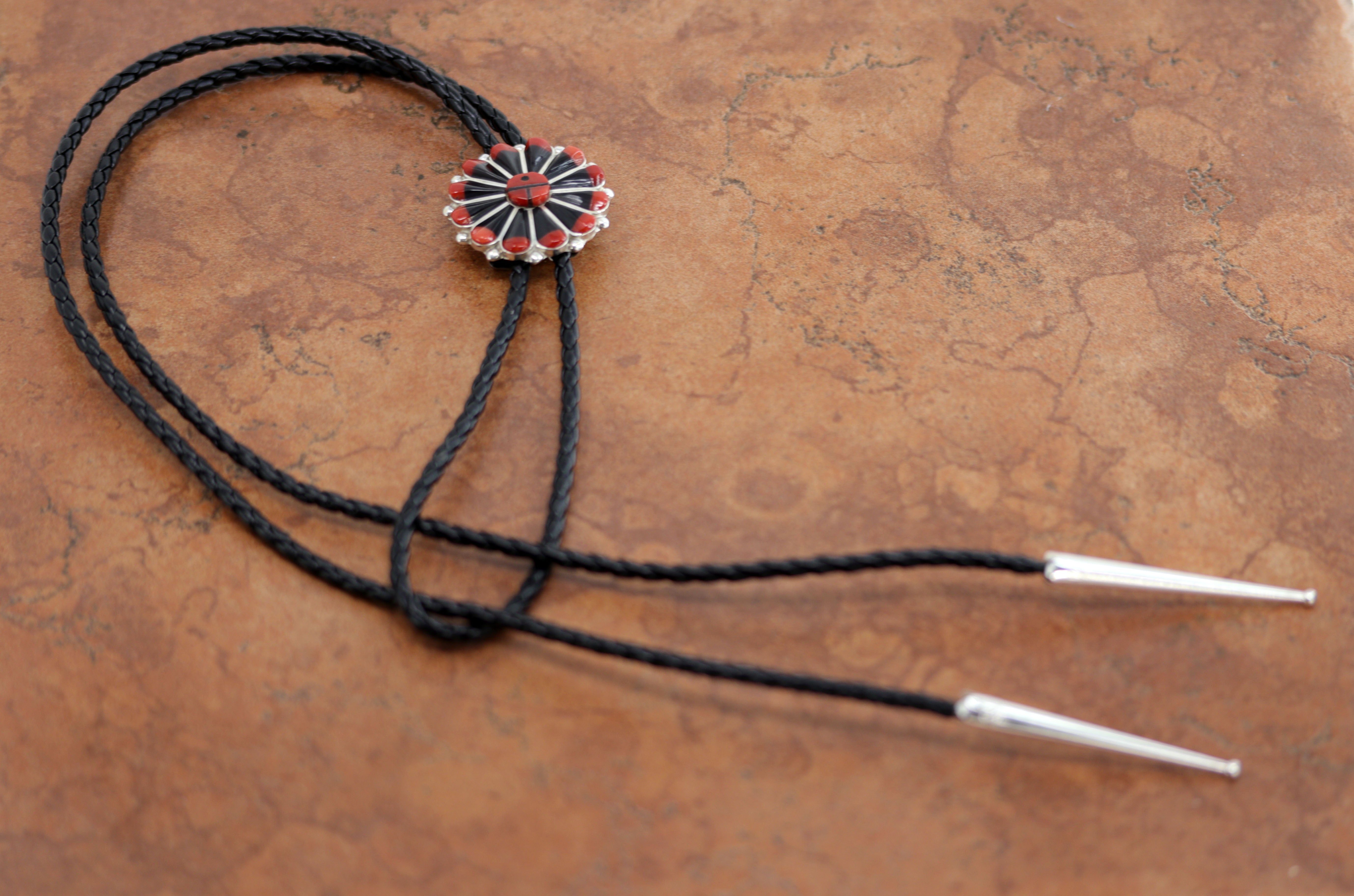 Zuni Native American Bolo Tie. The bolo tie is made of sterling silver jade, and coral. The cord is about 44". The bolo measures 1 1/2" in diameter.