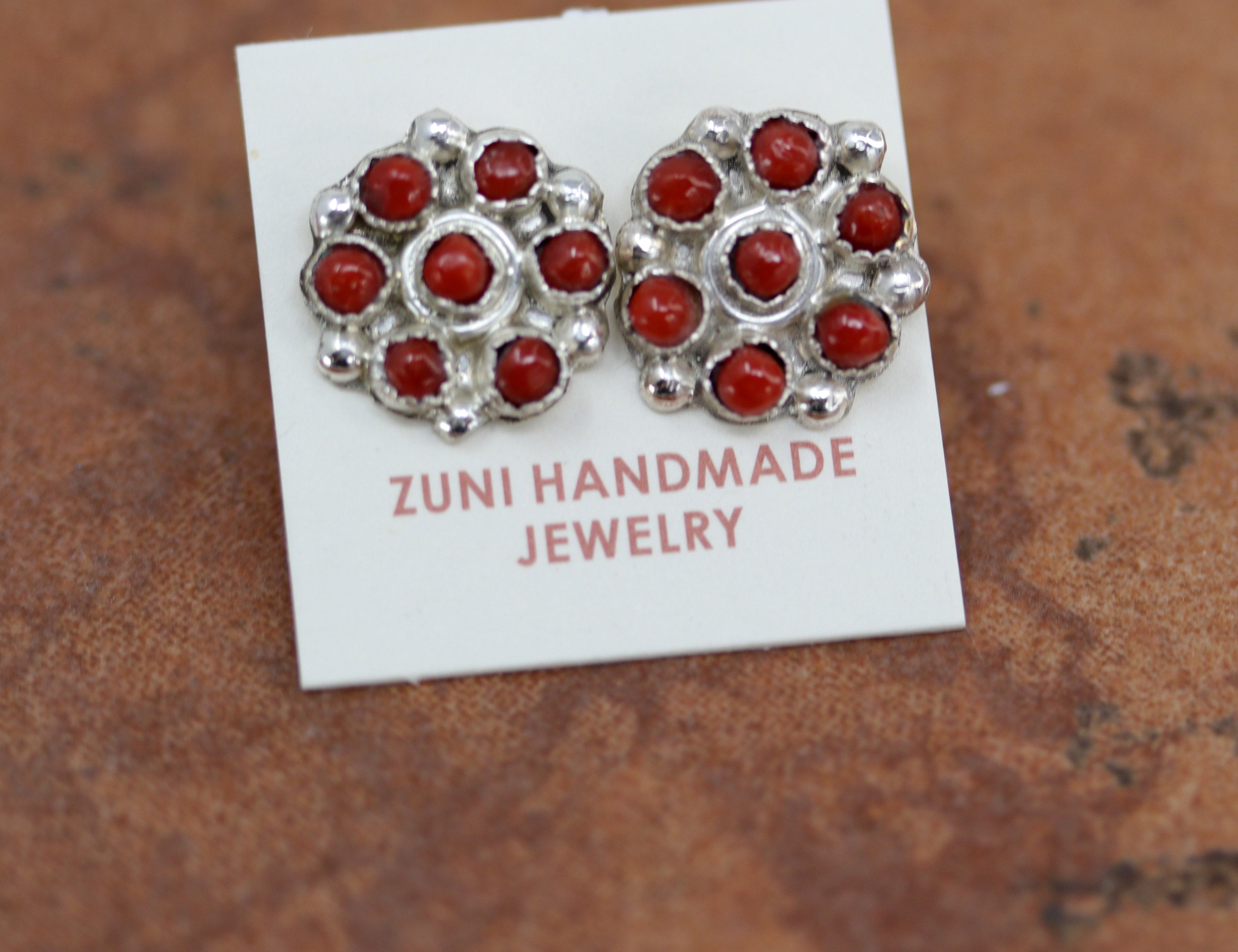Zuni Native American earrings. They are made from sterling silver and coral. Each earring is 1/2" in length.