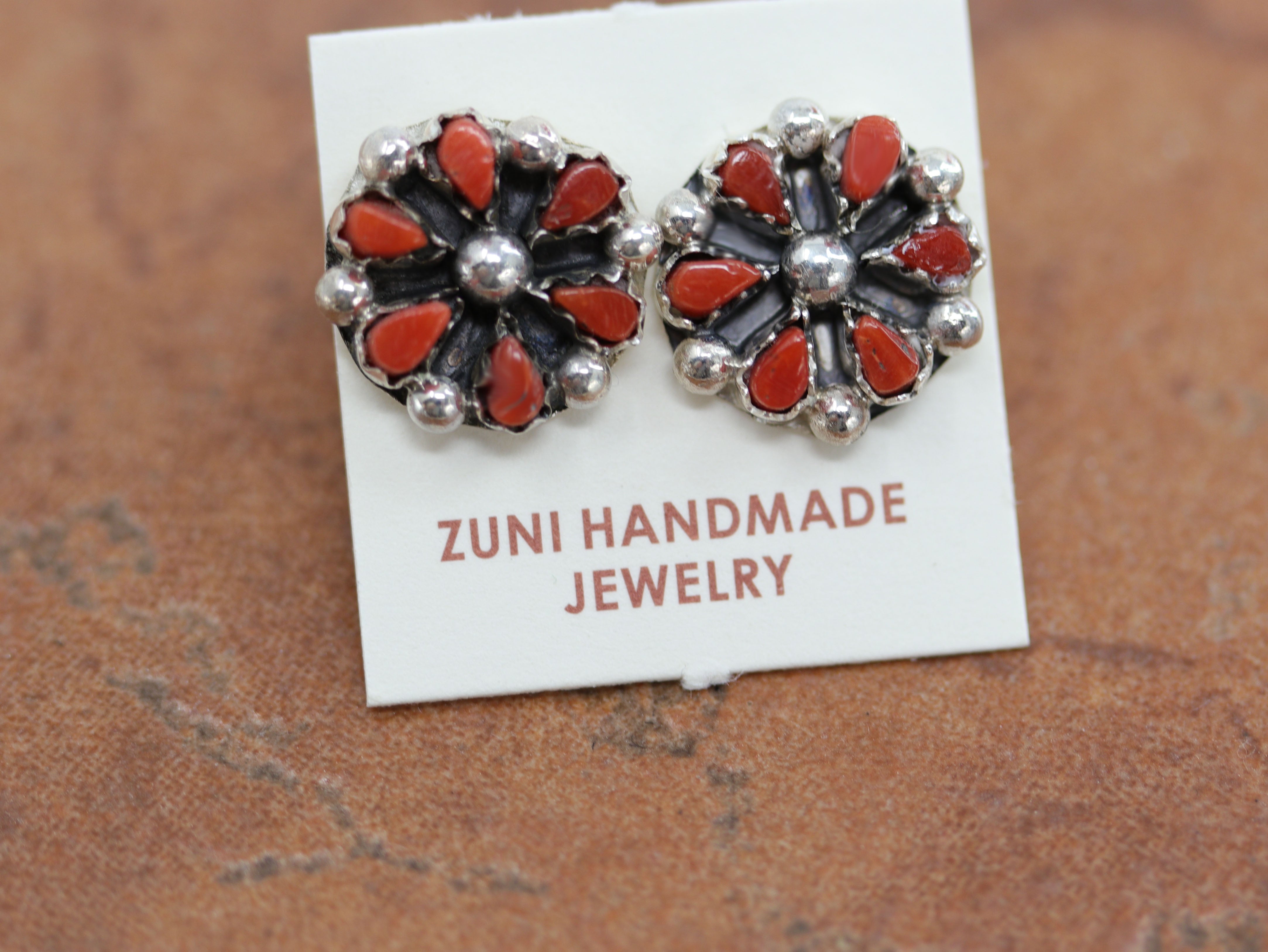 Zuni Native American stud earrings with a cluster design. They are made from sterling silver and coral. Each earring is 1/2" in length.