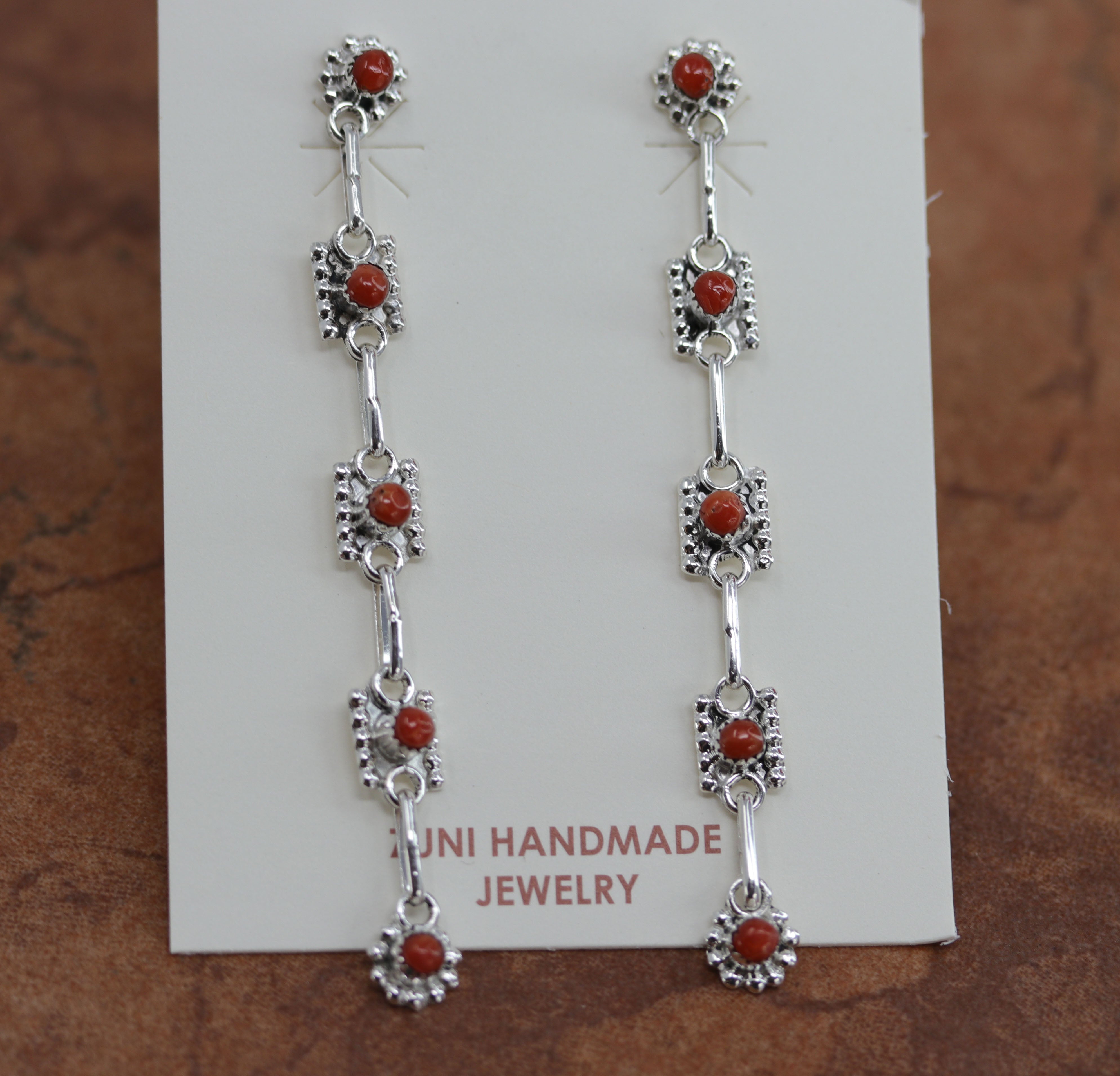 Beautiful Zuni Native American earrings. They are made from sterling silver and coral. Each earring is 3 1/4" in length, and about 3/8" in width.