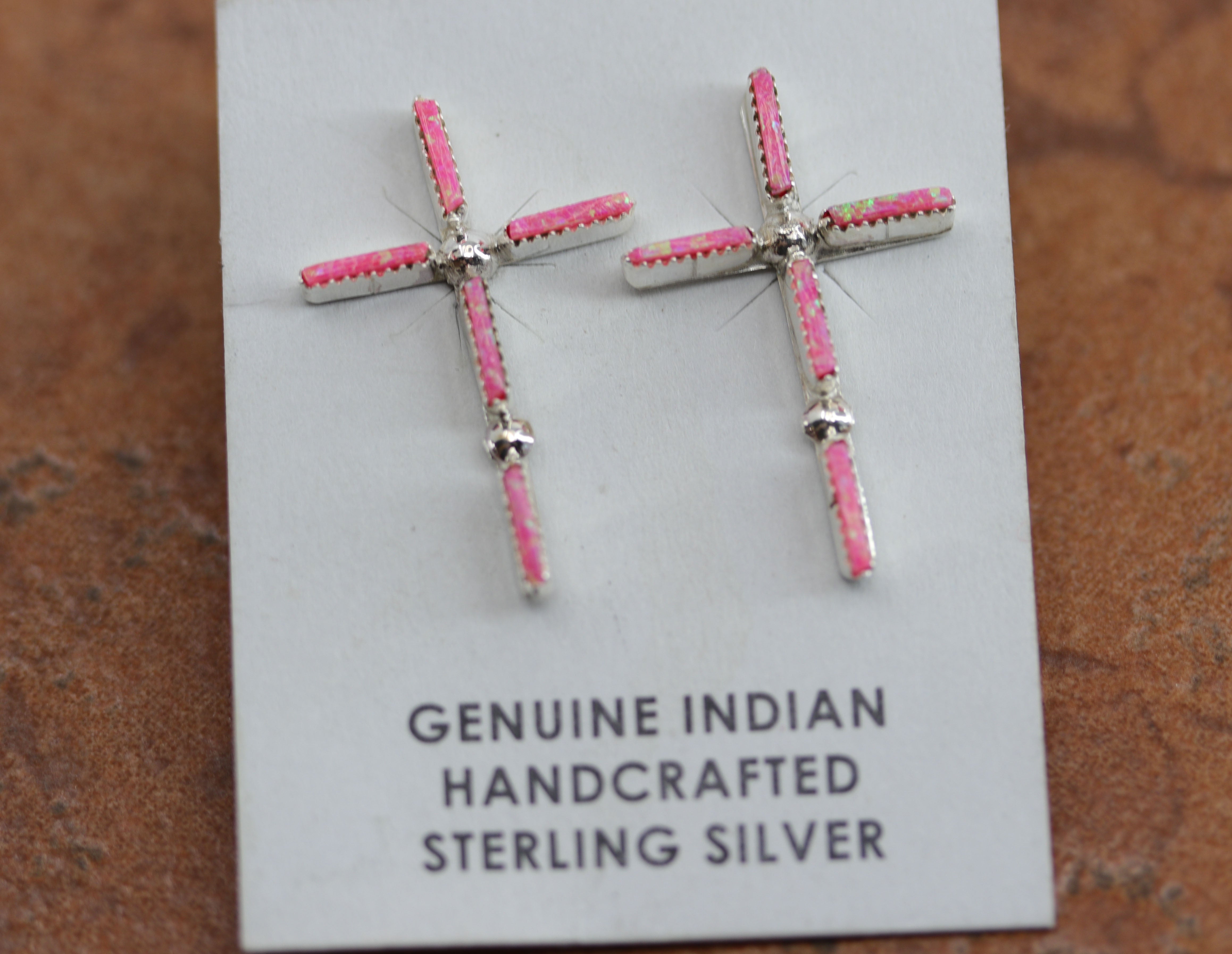 Beautiful Zuni Native American Cross earrings. They are made from sterling silver and created opal. Each earring is 1 1/8" in length, and about 3/4" in width.